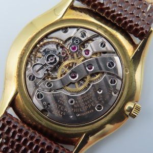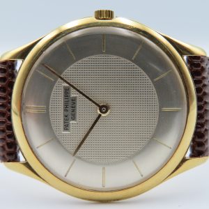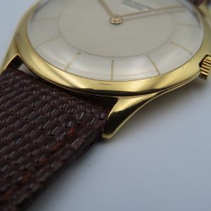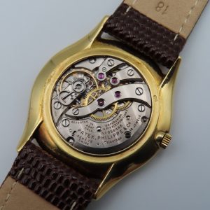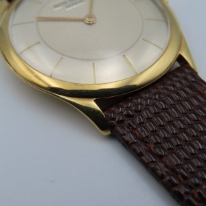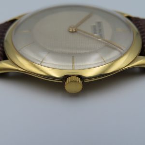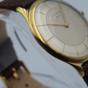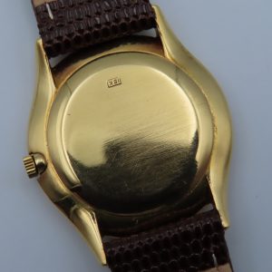 Features: 18k yellow gold case, brown leather two-piece strap, yellow-colored steel buckle, push/pull crown, acrylic crystal.