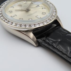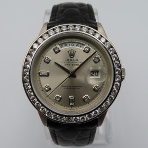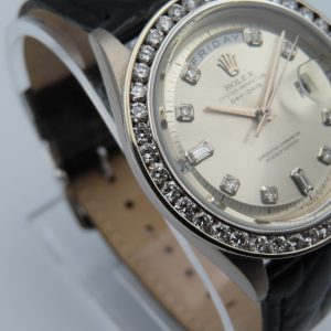 For sale is a 1964 Rolex Day-Date ref. 1803, with a custom 18k white gold diamond bezel and custom diamond dial. The watch case is 18k white gold and is fitted on a two-piece black leather non-Rolex strap with a stainless steel buckle. We performed a routine maintenance service on the watch in January 2026, and it is backed by us with a 1-year warranty. During the service, we did a full disassembly, cleaned it, oiled it, timed it for accuracy, and adjusted it. The watch is running and keeping accurate time.