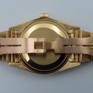 Features: The watch has an 18k yellow gold case, bracelet, and bezel, sapphire crystal, quick-set date, silver stick dial, screw-down crown, screw-back case, and a Rolex Cal. 3055 automatic movement with 27 jewels.