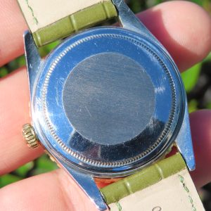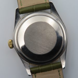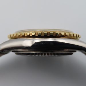 Features: Stainless steel case, 18k yellow gold bidirectional rotating bezel, 18k yellow gold signed screw-down crown, screw-back case, acrylic crystal, and powered by a Rolex Cal. 3035 automatic movement with 27 jewels.
