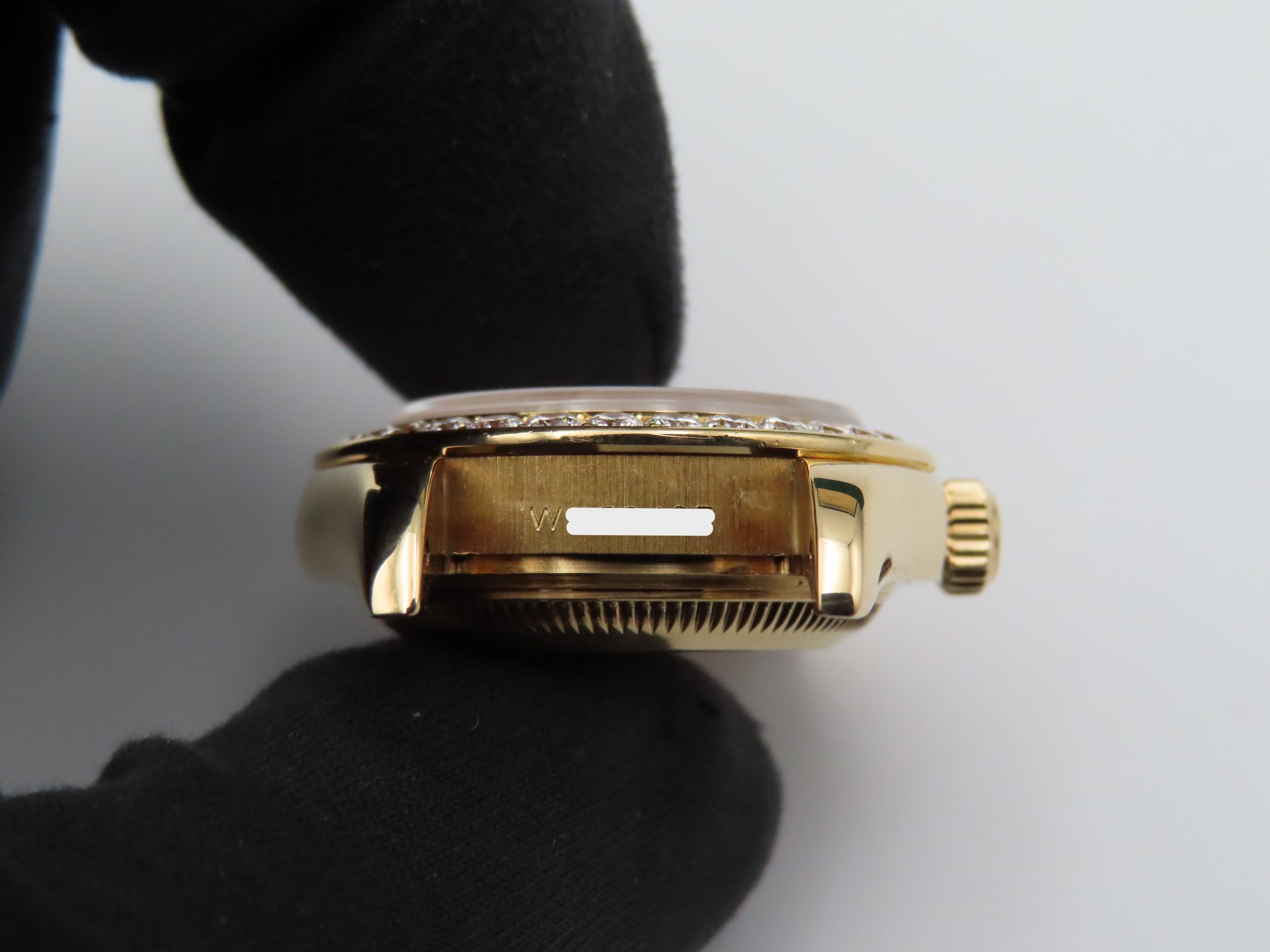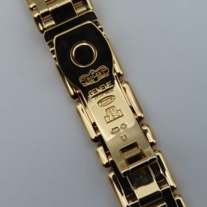 Condition: The watch is in good condition overall for its age. As a pre-owned watch it has normal wear, including scratches and scuffs on the case and bracelet. All the diamonds on the bezel are excellent; however, the outer gold ring has some scratches and scuffs, similar to the case. The dial, hands, and sapphire crystal are all in good condition. The bracelet clasp opens and closes securely with no issues.