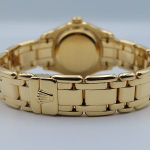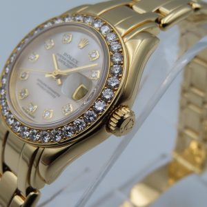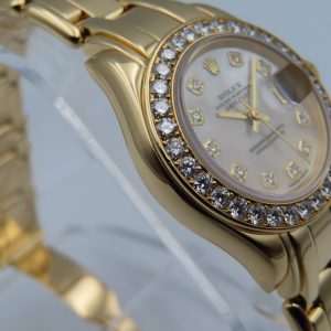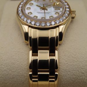 For sale is a women’s pre-owned 1995 Rolex Datejust Pearlmaster 29mm, model/reference number 69298 in 18k yellow gold, featuring a factory mother-of-pearl diamond dial and a factory diamond bezel.