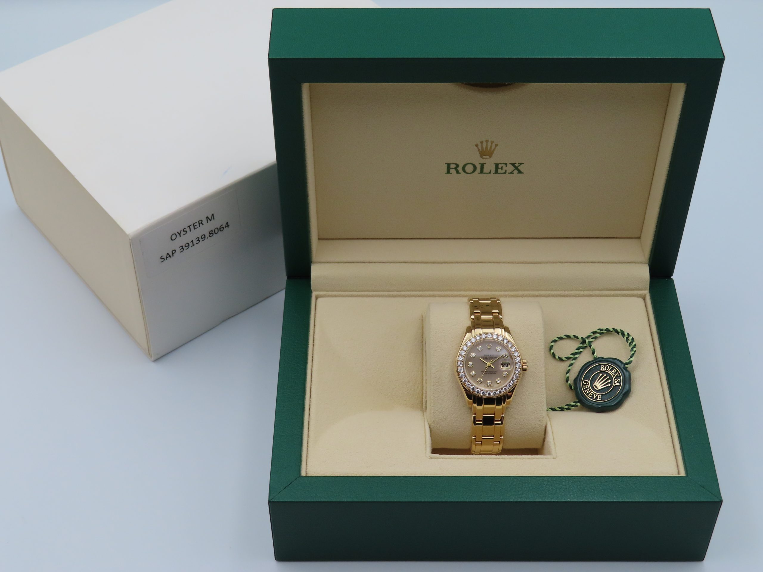 Features: 18k yellow gold case and bracelet, factory diamond bezel, factory mother-of-pearl diamond dial, quick-set date, screw-down crown, screw-back case, sapphire crystal, and a Rolex Caliber 2135 automatic movement with 29 jewels and an approximate 42-hour power reserve.
