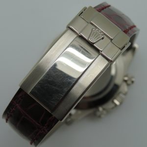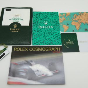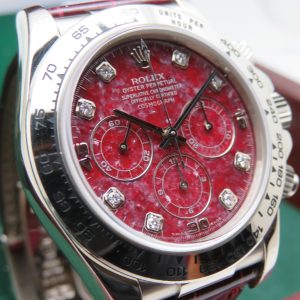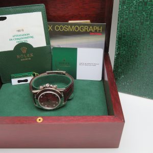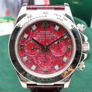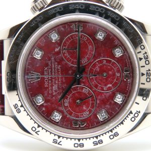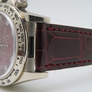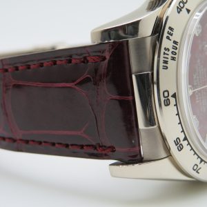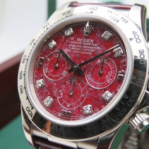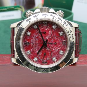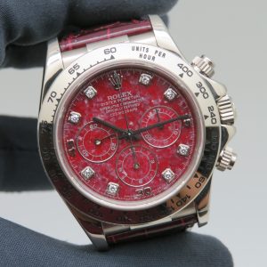 For sale is a 1998 Rolex Daytona 16519 with a Grossular Rubellite Diamond dial. It was first sold in 1999. The watch comes as a complete set, including boxes, papers, serialized hang tag, calendar card, the original 1995 Daytona booklet, and a 1999 calendar card. The Daytona booklet is original and matching.