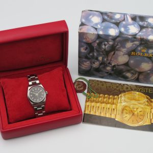 For sale is a 1999 Ladies Rolex Oyster Perpetual 31mm. The watch does not come with the original box or papers, so we complimentarily added genuine Rolex items. To be clear, these are not the exact items the watch was originally issued with in 1999, but they are from the same era. The watch itself is all original besides the crystal, which is an aftermarket sapphire crystal. The condition of the watch is good for its age; it carries some surface scratches and scuffs throughout the case, bezel, and bracelet. The sapphire crystal also has a couple of very small surface scuffs in the AR coating. We serviced the watch and are backing it with a 1-year warranty through our shop.