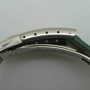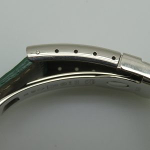 The watch is in fair condition overall due to it’s visible surface scratches and scuffs on the case, clasp, and bezel. The strap is brand new, never worn. The clasp has more noticeable surface scratches.