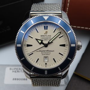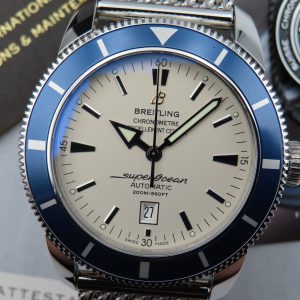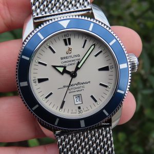 For sale is a pre-owned 2016 men’s Breitling Superocean Heritage 46, model/reference number A17320. The watch comes with the original box and papers and is 100% original inside and out. The watch is running perfectly, keeping accurate time, and functioning as it should with no issues. The watch does not require a service at this time. We’re backing the watch with a 1-year warranty through our shop.