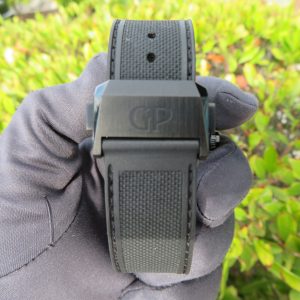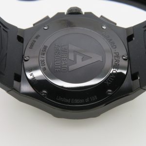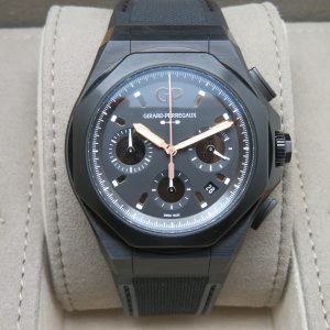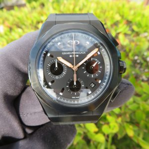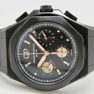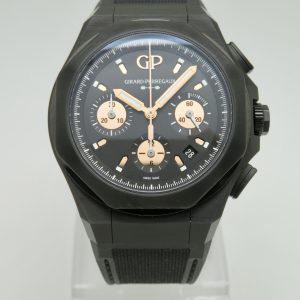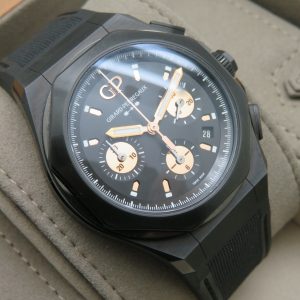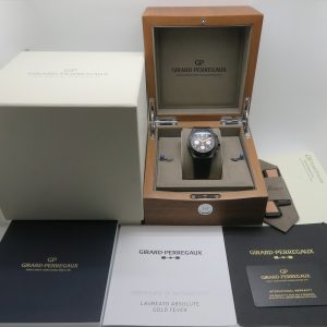 For sale is a mens pre owned 2022 Swiss made Girard Perregaux Laureato Absolute Gold Fever automatic chronograph with date. The watch model/reference number is 81060-21-492-FH3A. It features a sapphire crystal, screw down crown, titanium PVD coated case, screw in back, quickset date, and a caliber GP 03300 in house movement (63 jewels, 46 hour reserve, and a bph of 28800). The watch measures approximately 44mm in diameter without the crown, by 53mm lug tip to tip, has a lug width of 27mm, and a case thickness of 14.9mm.
