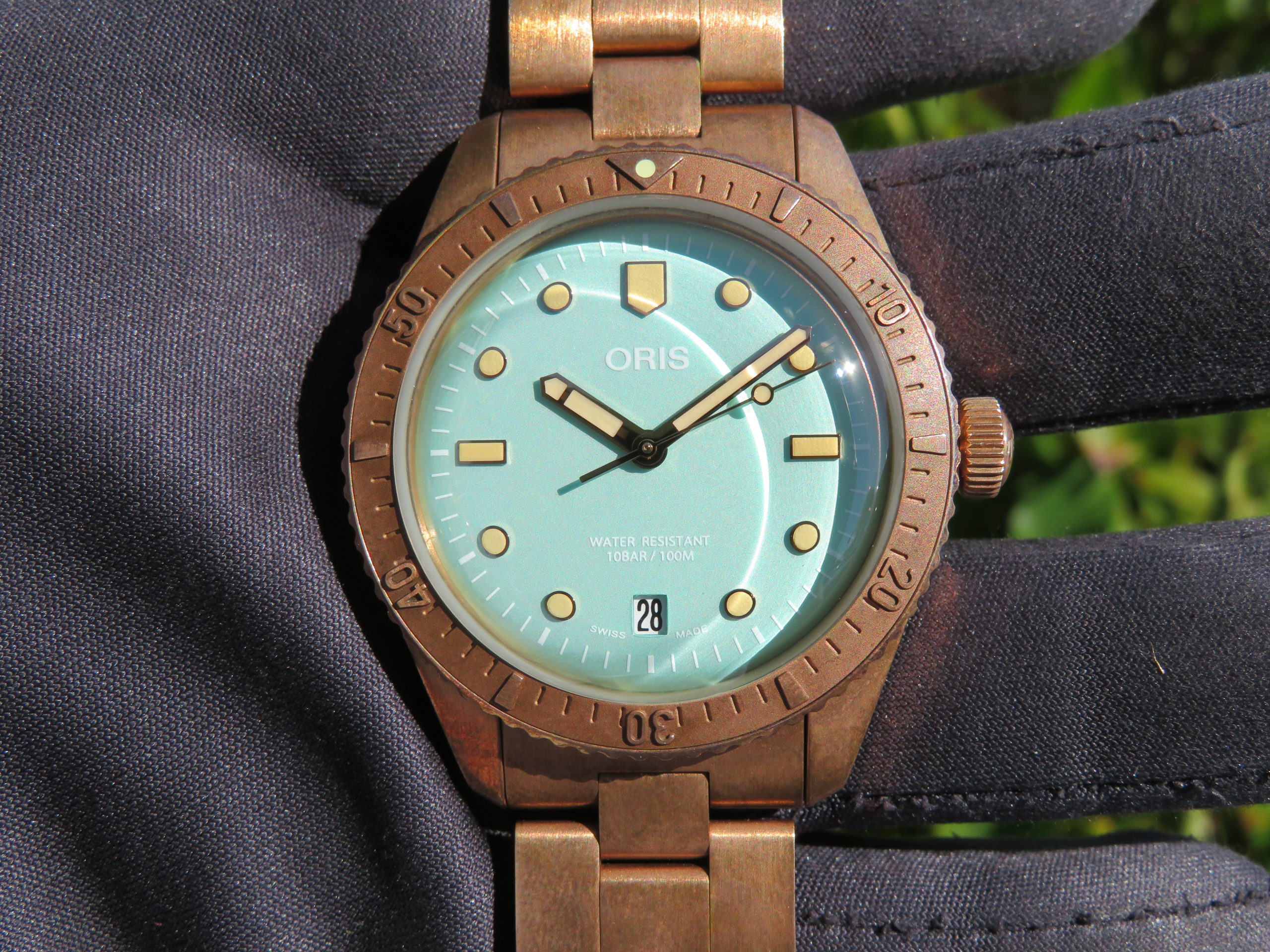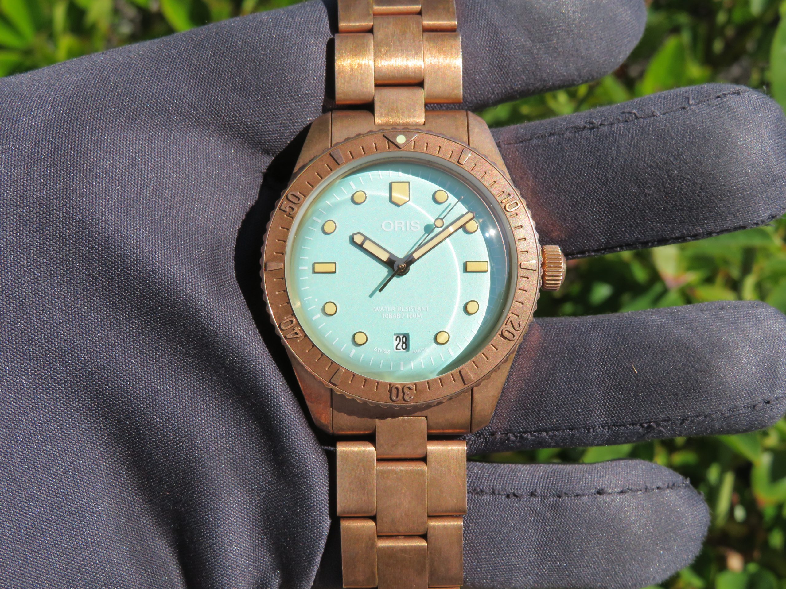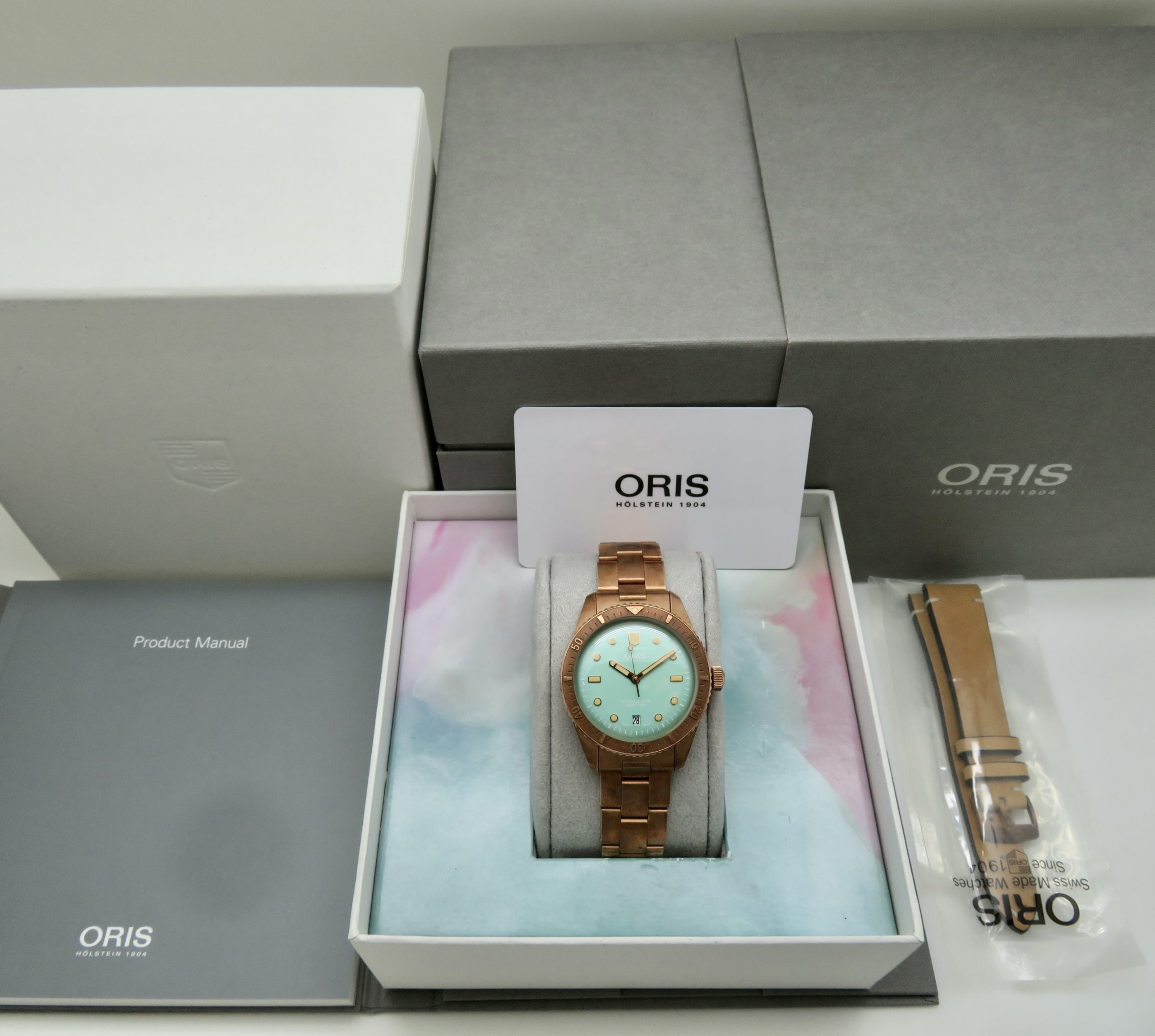 The watch runs perfect and keeps excellent time. It will come with a one year warranty directly through our shop. The watch was purchased new on 03/31/2022. It has its original box, papers, all the links, and the leather strap. The bronze has aged and it has surface scuffs, all of which look nice and natural. The overall condition of the watch is very good. Free shipping in the USA. Shipping outside of the USA is $100. Import taxes and customs fees are buyers responsibility. We have a three day return policy, meaning you have three days from the time you receive it to decide if you’d like to keep it or not. The item must be returned in the same condition as received. Return shipping costs are buyers responsibility.