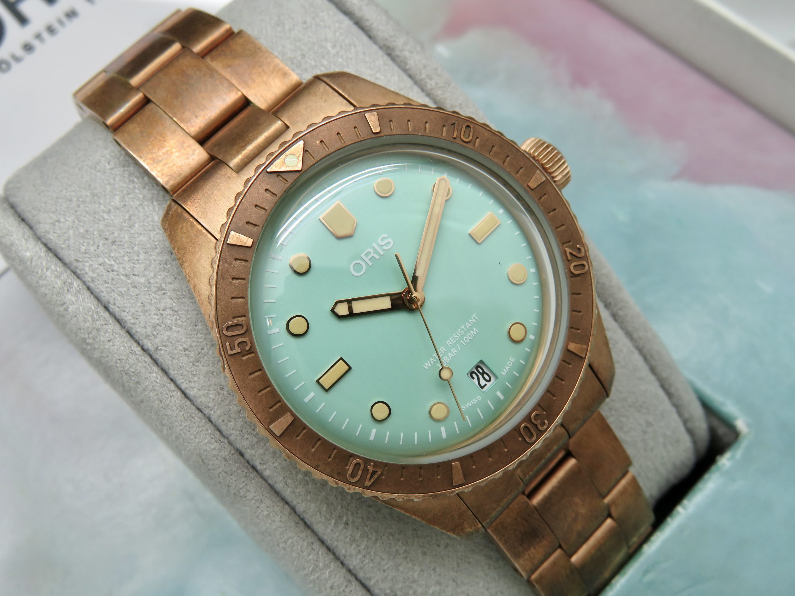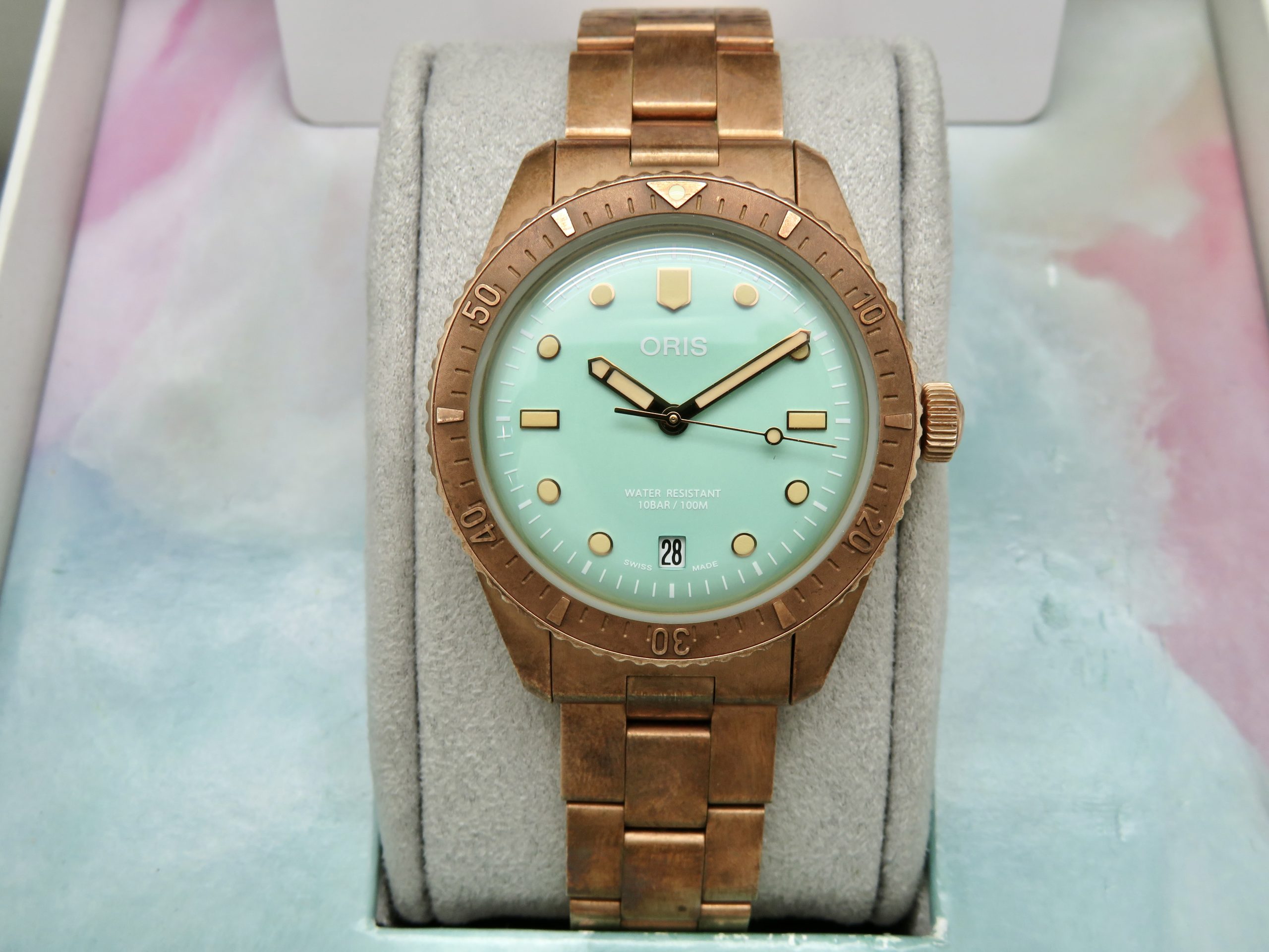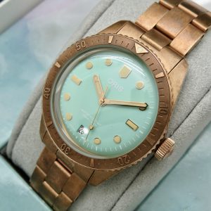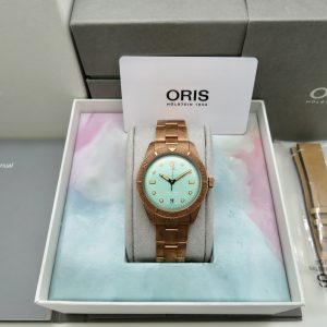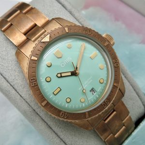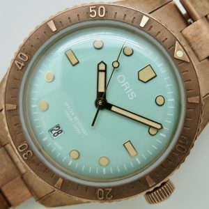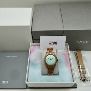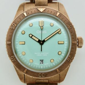 For sale is a mens pre owned 2022 Oris Divers Sixty Five Cotton Candy mens automatic wristwatch with date. The watch model/reference is 01 733 7771 3157. It features a wild green dial, round bronze case, steel screw in back, unidirectional rotating bezel, screw in crown, hacking seconds, quickset date, and a caliber 733 movement (SW200-1, 26 jewels, 38 hour power reserve, and a bph of 28800). The watch measures 38mm in diameter without the crown, by 45.75mm lug tip to tip, has a lug width of 19mm, and a case thickness of 13mm.