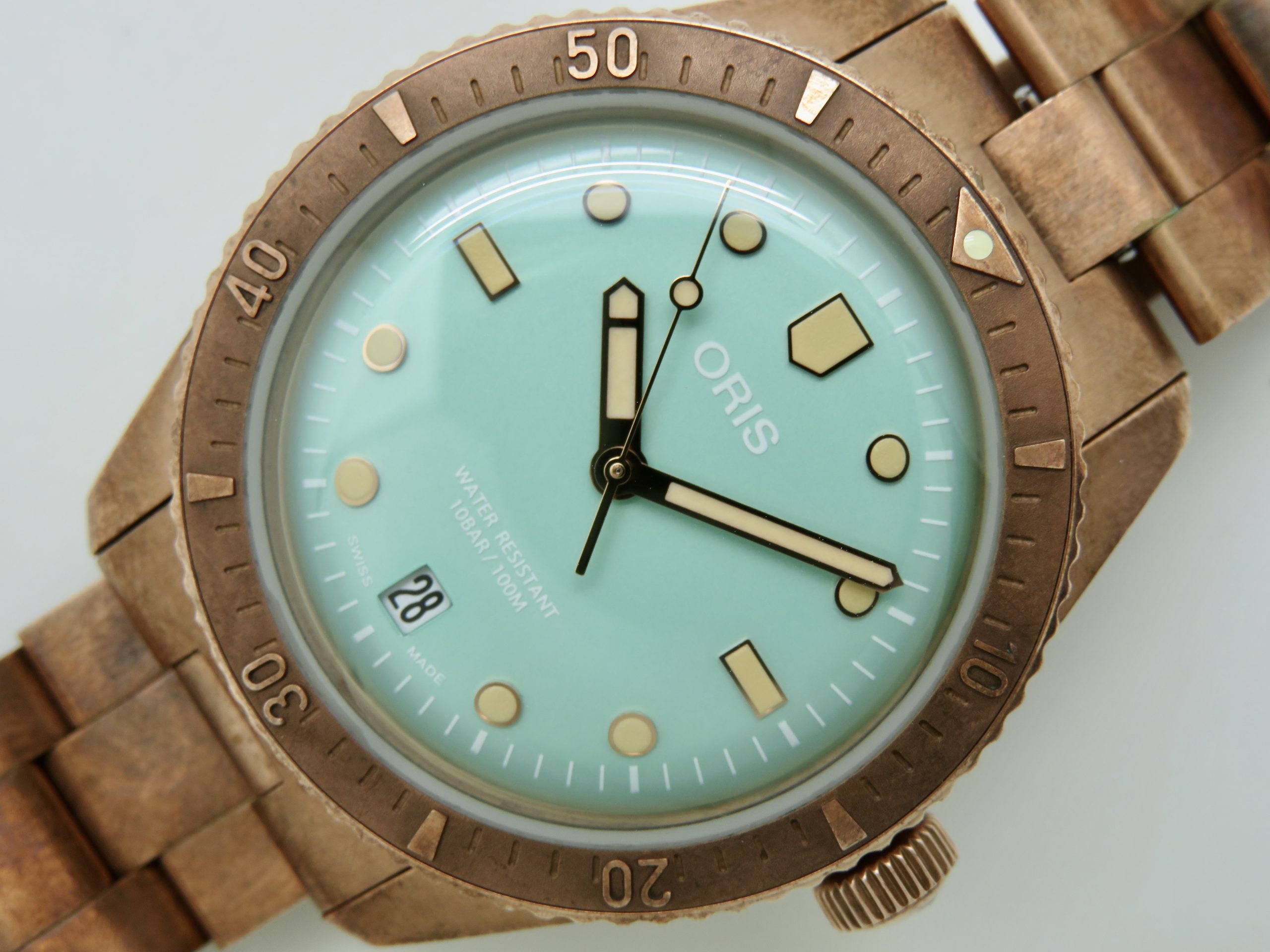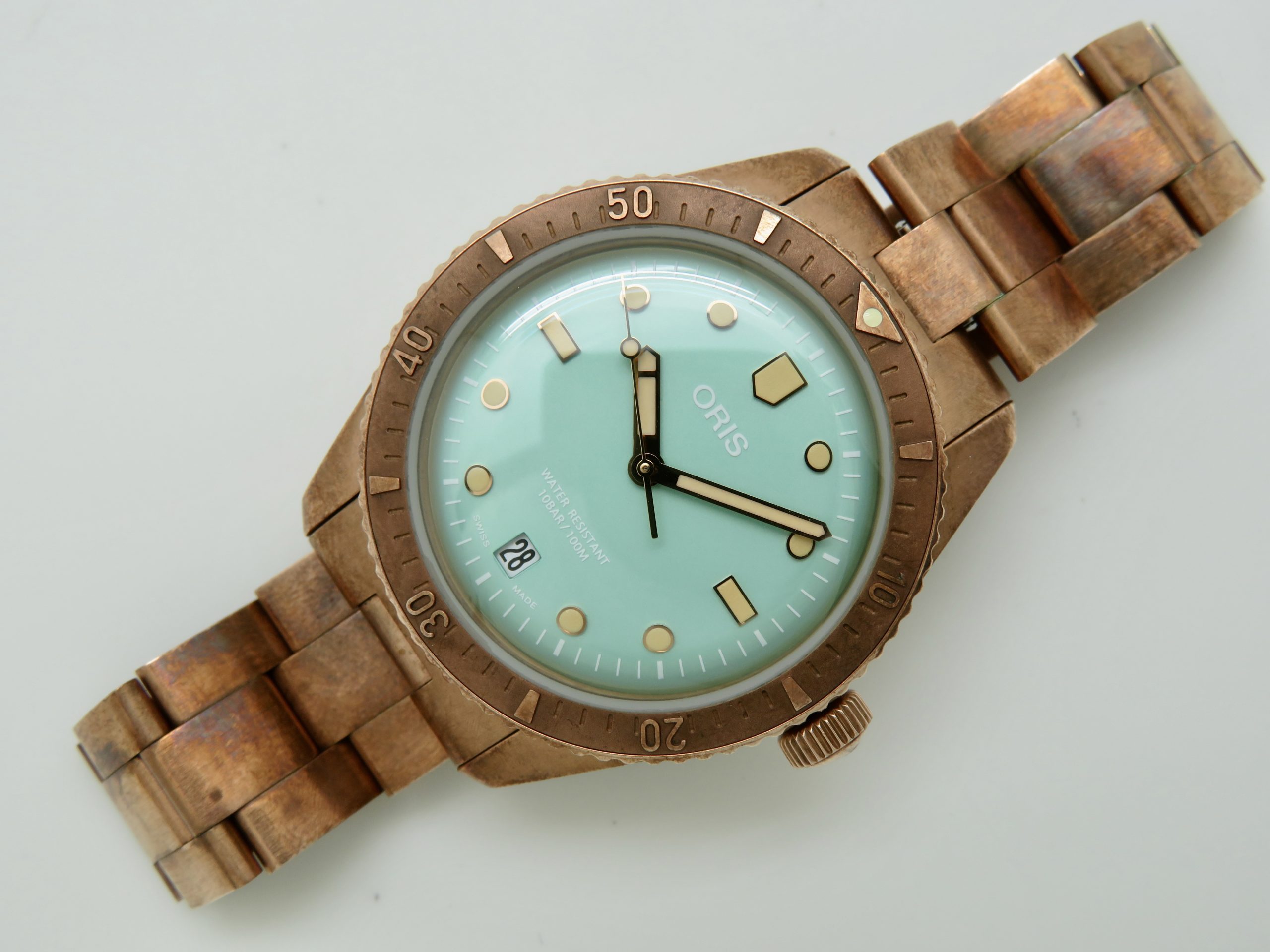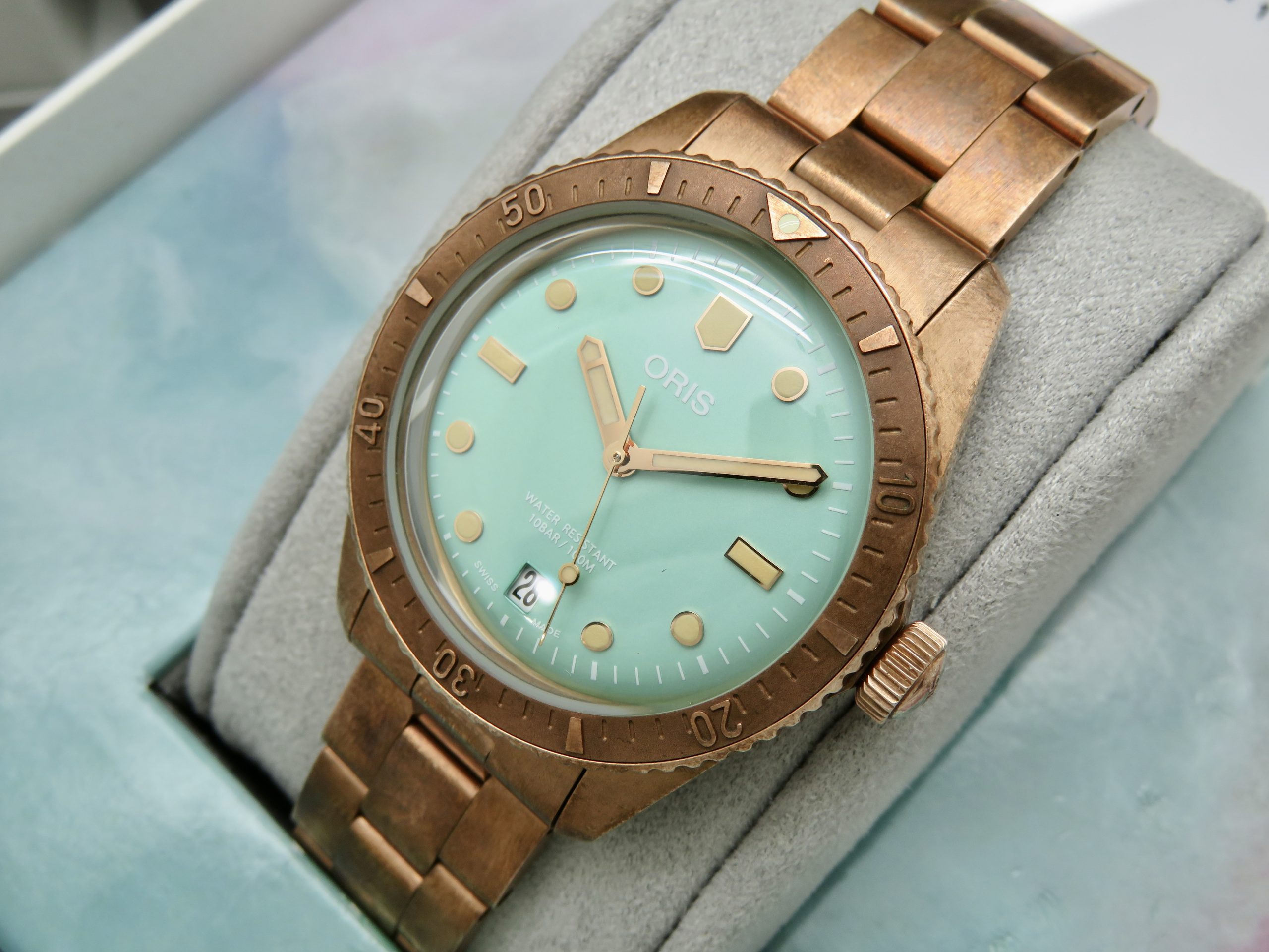 For sale is a mens pre owned 2022 Oris Divers Sixty Five Cotton Candy mens automatic wristwatch with date. The watch model/reference is 01 733 7771 3157. It features a wild green dial, round bronze case, steel screw in back, unidirectional rotating bezel, screw in crown, hacking seconds, quickset date, and a caliber 733 movement (SW200-1, 26 jewels, 38 hour power reserve, and a bph of 28800). The watch measures 38mm in diameter without the crown, by 45.75mm lug tip to tip, has a lug width of 19mm, and a case thickness of 13mm.