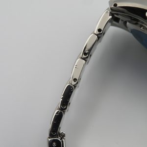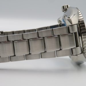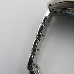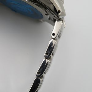 The watch is pre-owned, so you can expect noticeable scratches and scuffs on the case and bracelet. The bracelet also has some deep nicks on the sides of the links (all shown in photos). The aluminum bezel insert, sapphire crystal, and dial remain clean and scratch-free.
