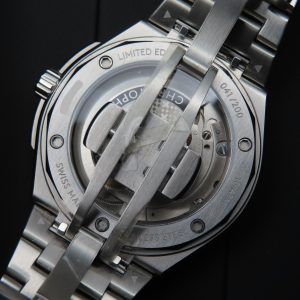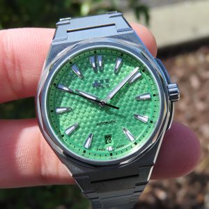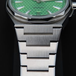 This watch features a Sellita SW200-1 automatic movement with 26 jewels, a brushed finish stainless steel case and bracelet, sapphire crystal, luminous hands and hour markers, a screw-down crown, and an exhibition case back. The bracelet also features a convenient micro-adjustment system on two of the links that allows you to easily adjust the size by simply pulling the links apart.
