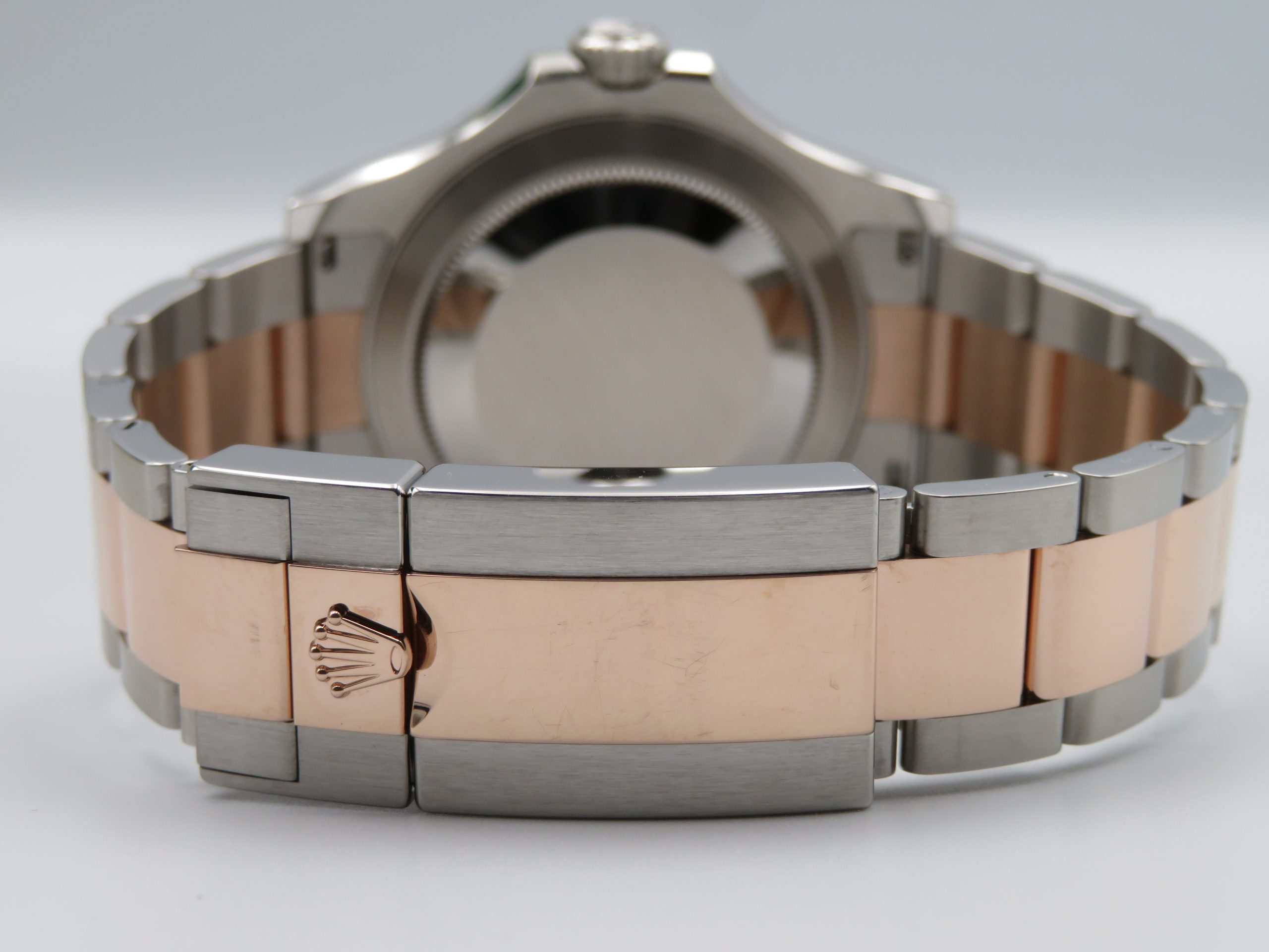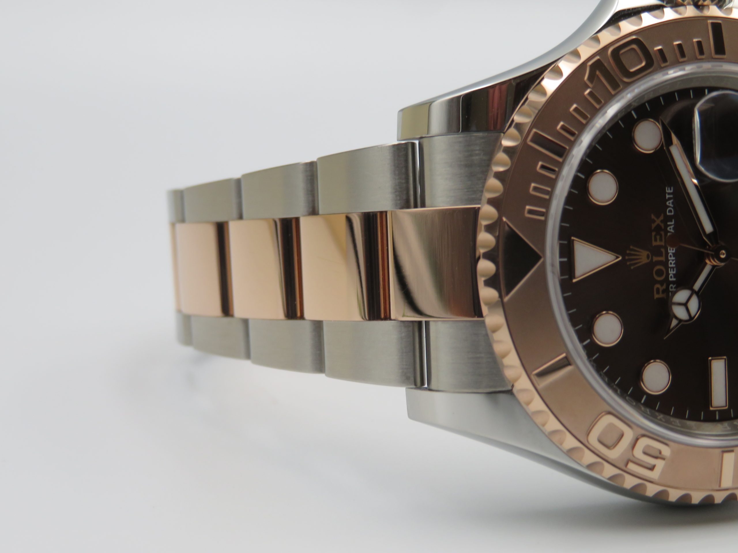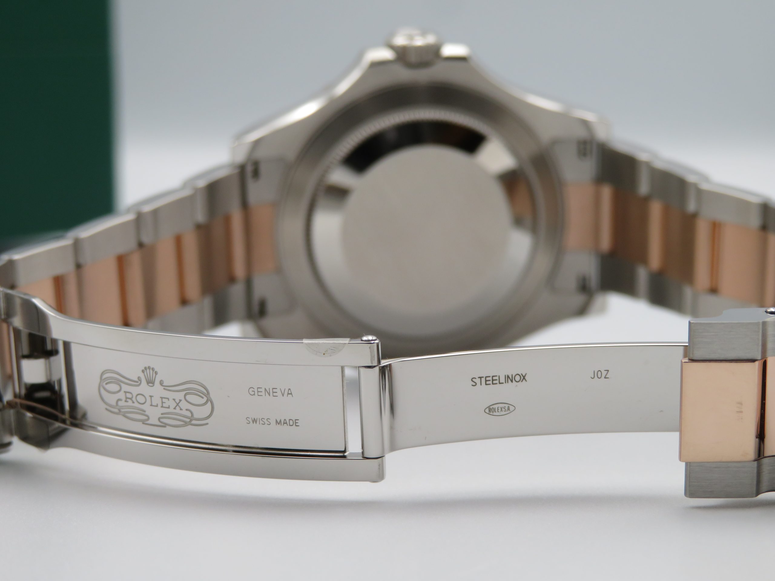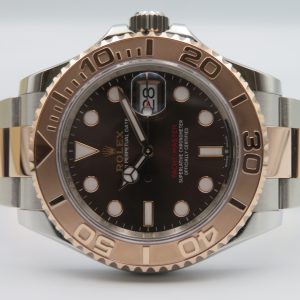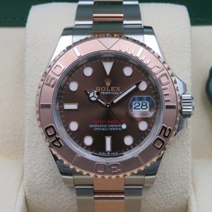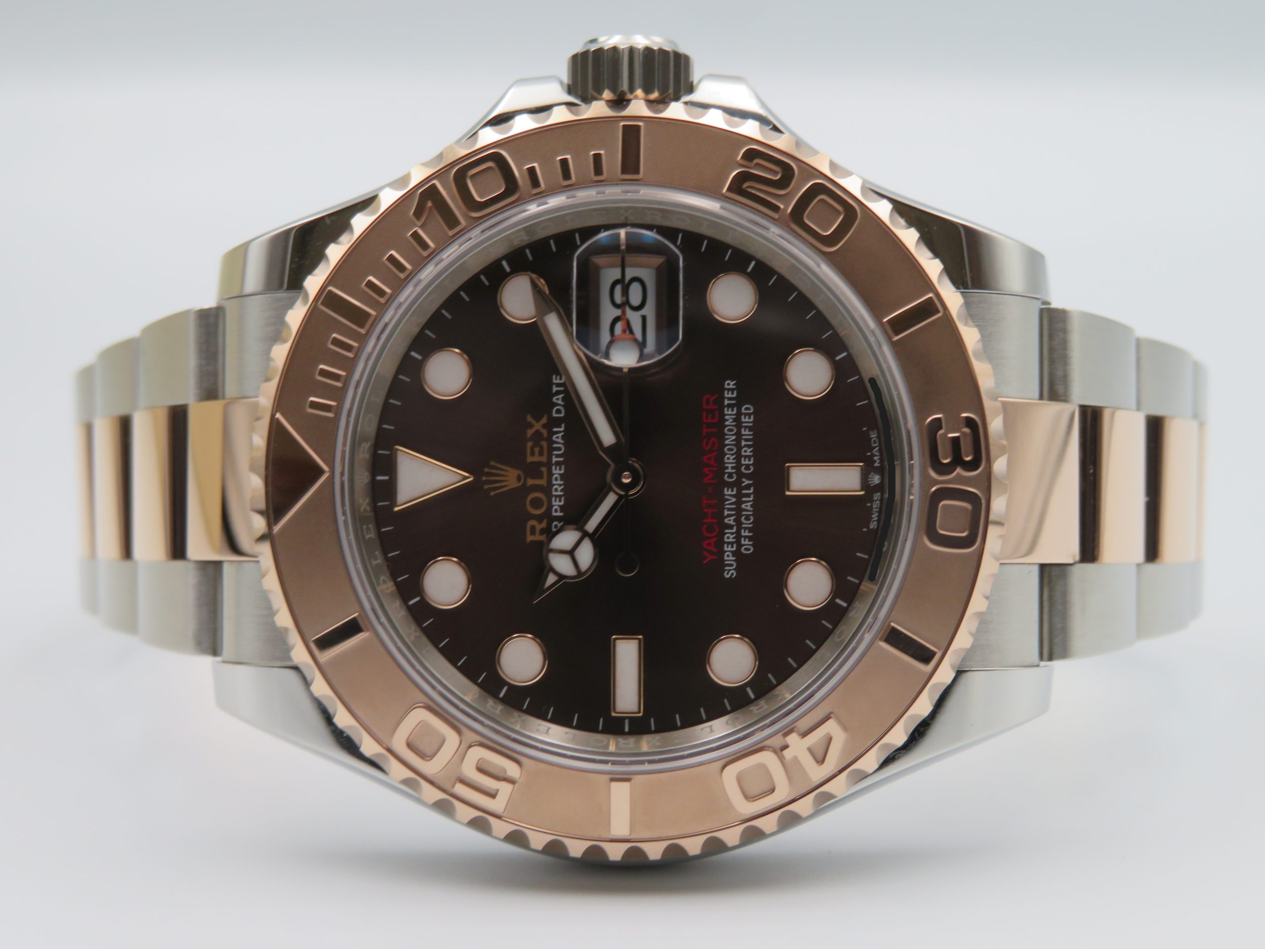 For sale: Pre-owned 2024 Rolex Yacht-Master, model 126621, featuring an 18k Everose gold and stainless steel case with a chocolate sunburst dial. The watch comes with both its boxes, green chronometer hangtag, guarantee manual, and warranty manual. (No white tag or bezel protector – what’s shown is what’s included.)