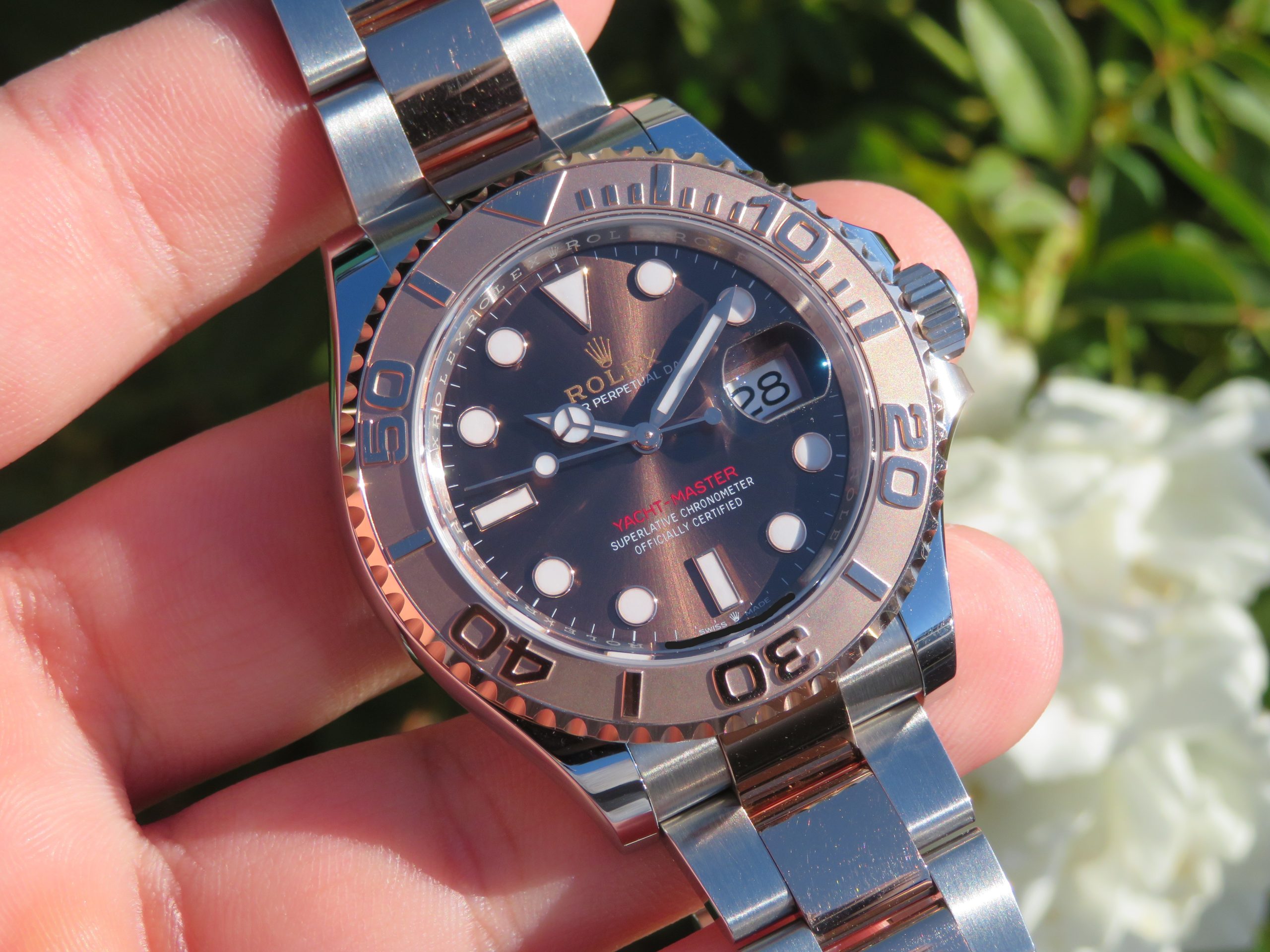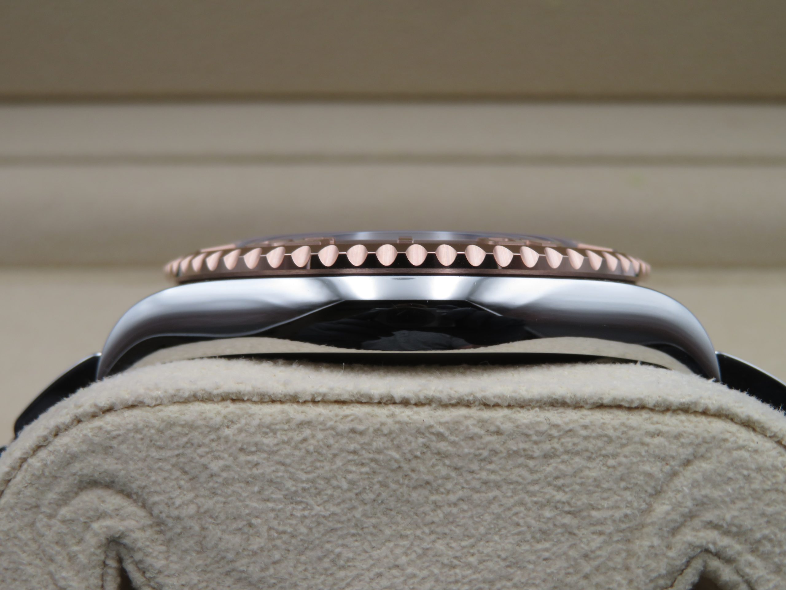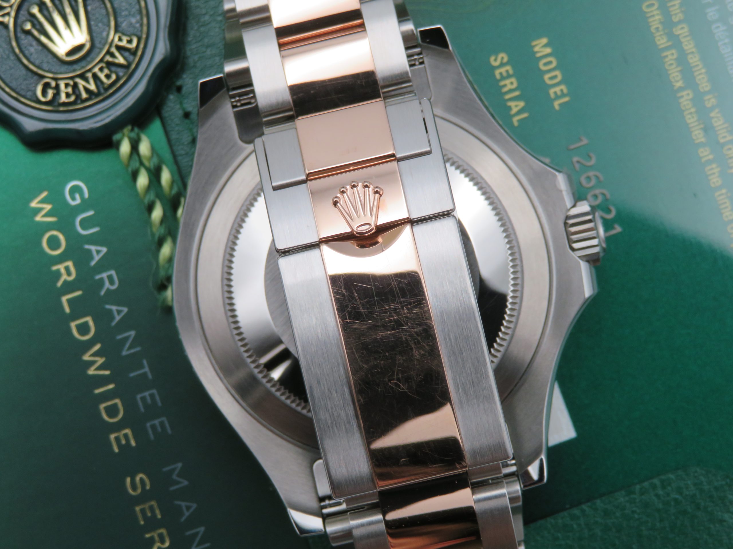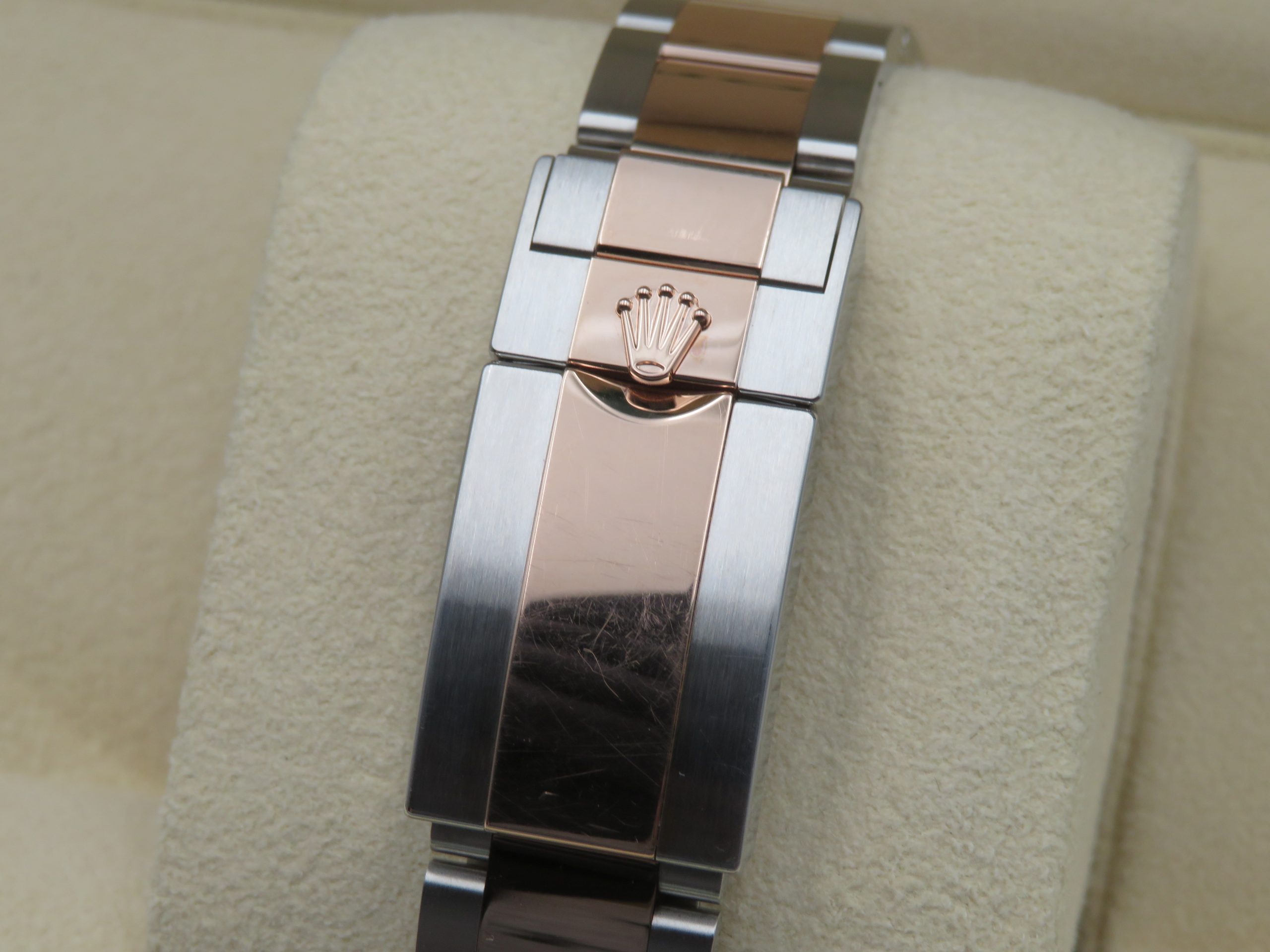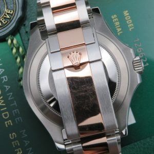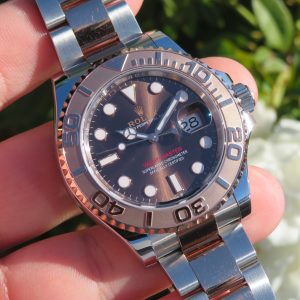 For sale: Pre-owned 2024 Rolex Yacht-Master, model 126621, featuring an 18k Everose gold and stainless steel case with a chocolate sunburst dial. The watch comes with both its boxes, green chronometer hangtag, guarantee manual, and warranty manual. (No white tag or bezel protector – what’s shown is what’s included.)