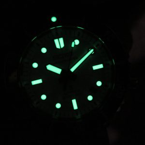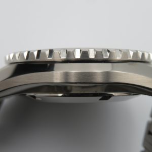 The watch has slight surface scuffs and scratches throughout the case and bracelet. The steel portion of the bezel has minor scuffs on the edges; the ceramic insert itself is in excellent condition, as is the sapphire crystal.