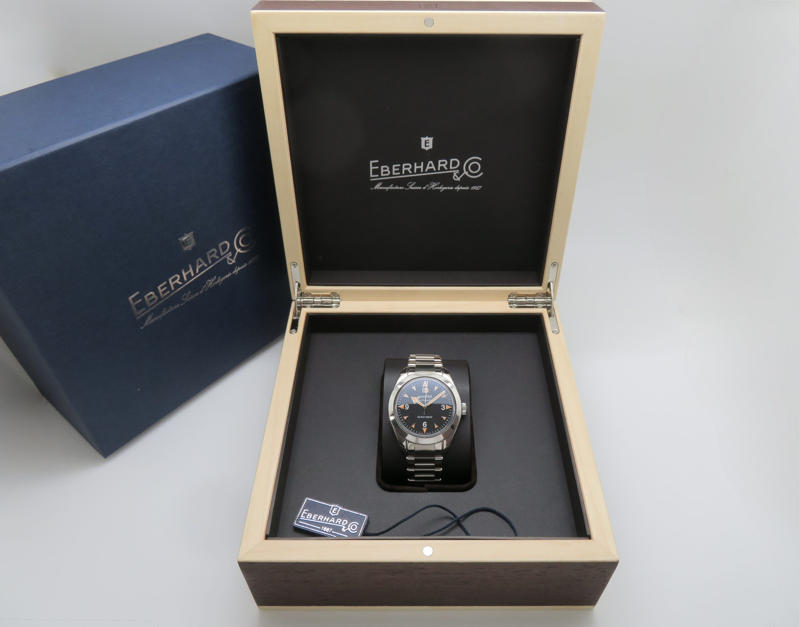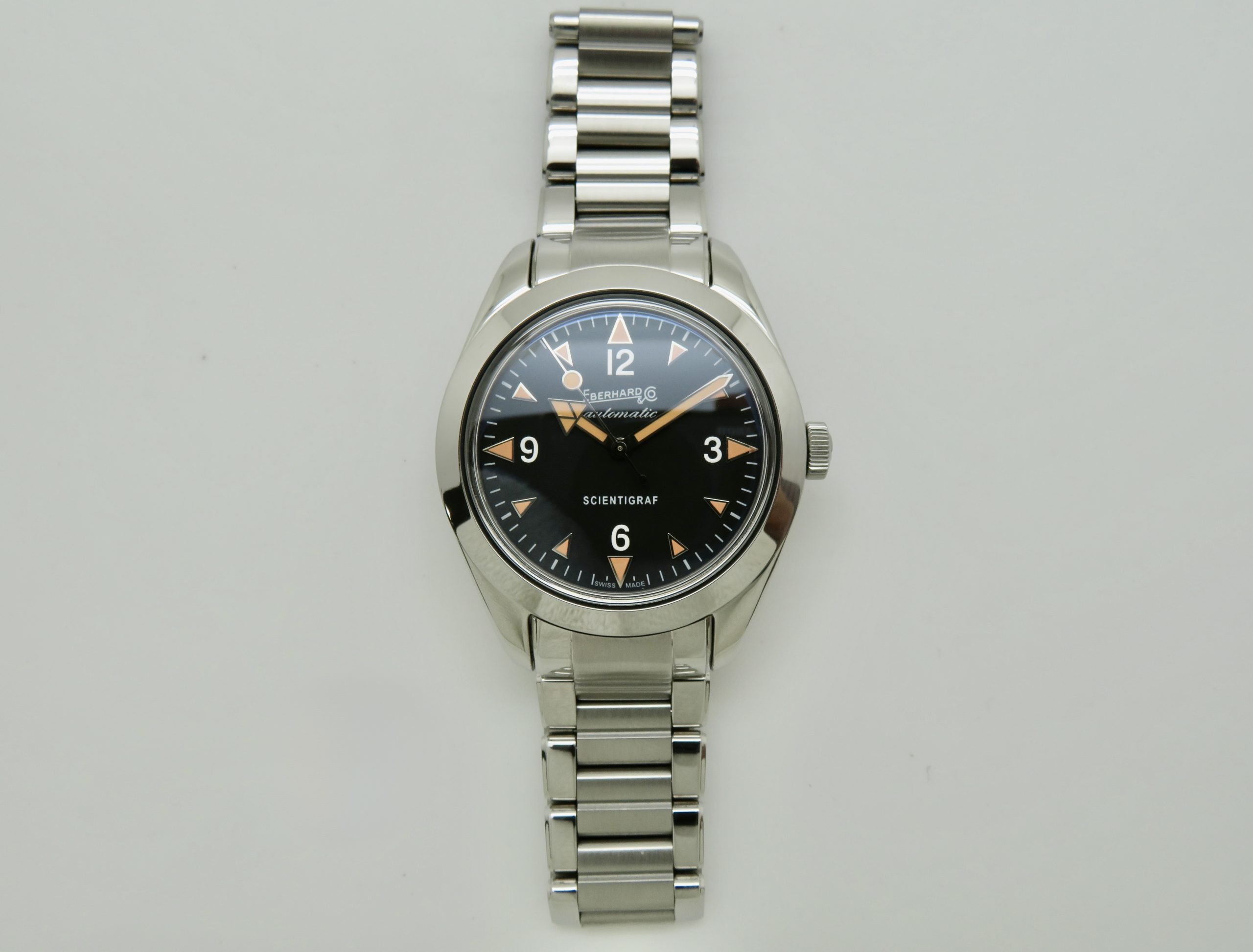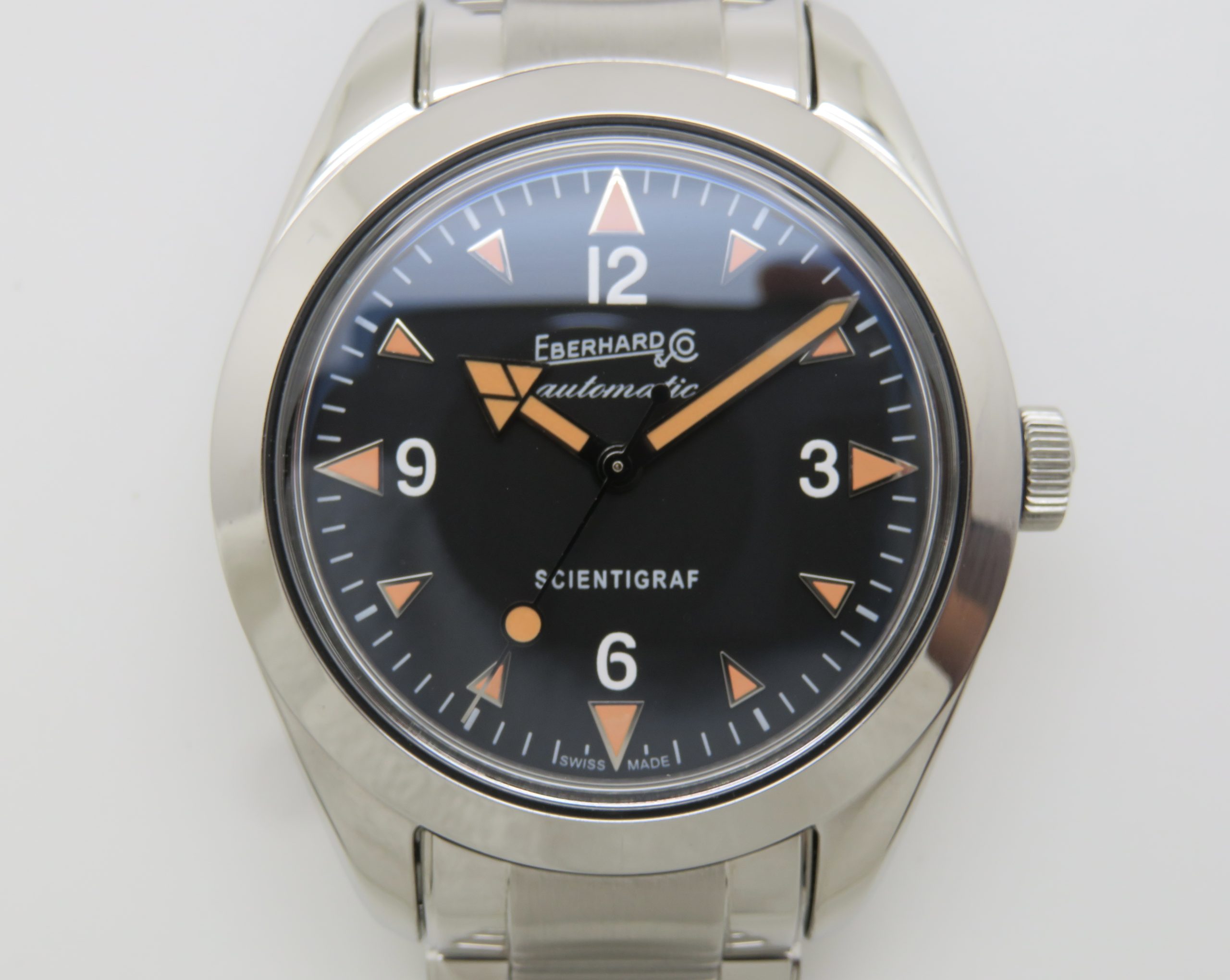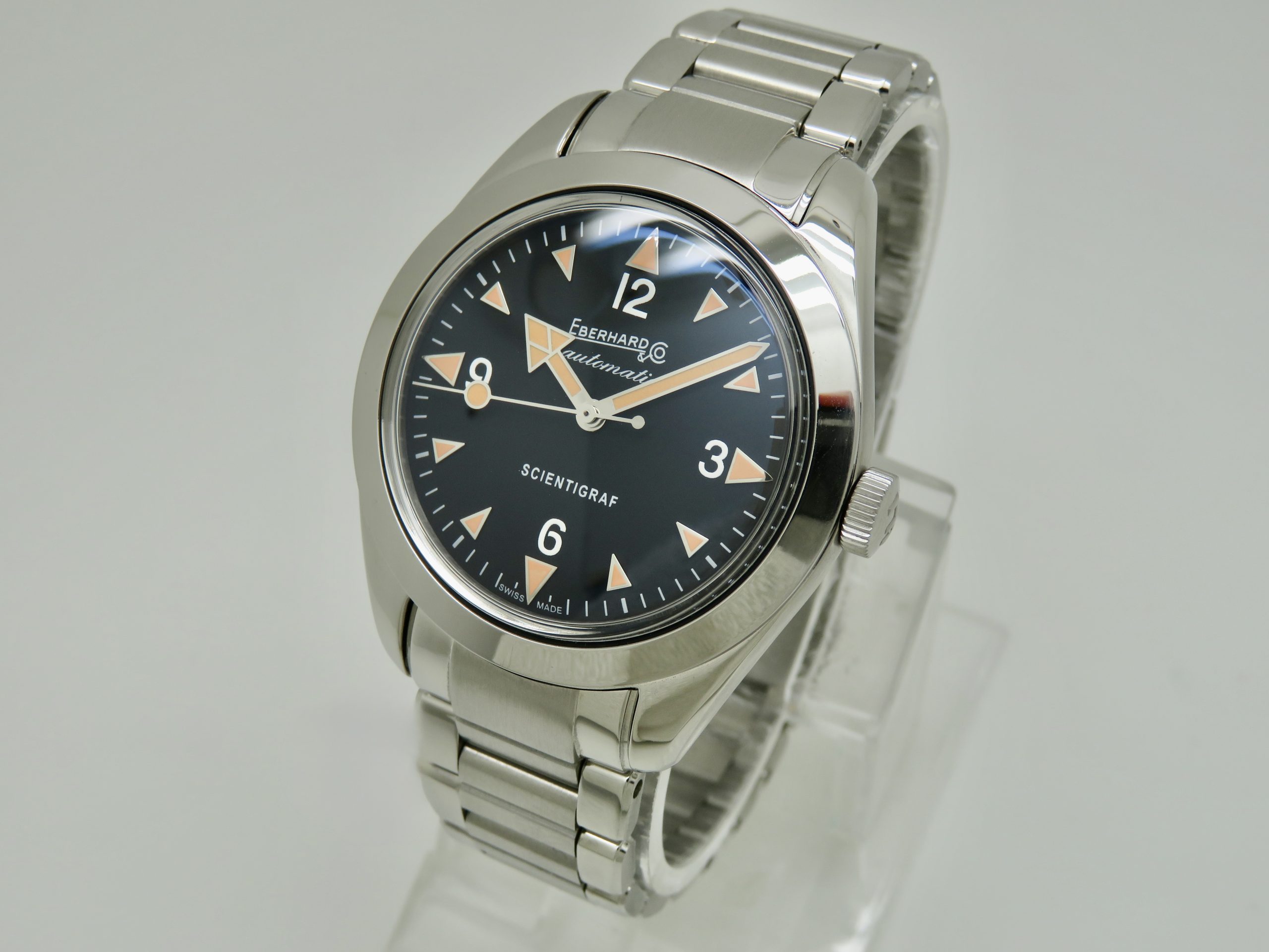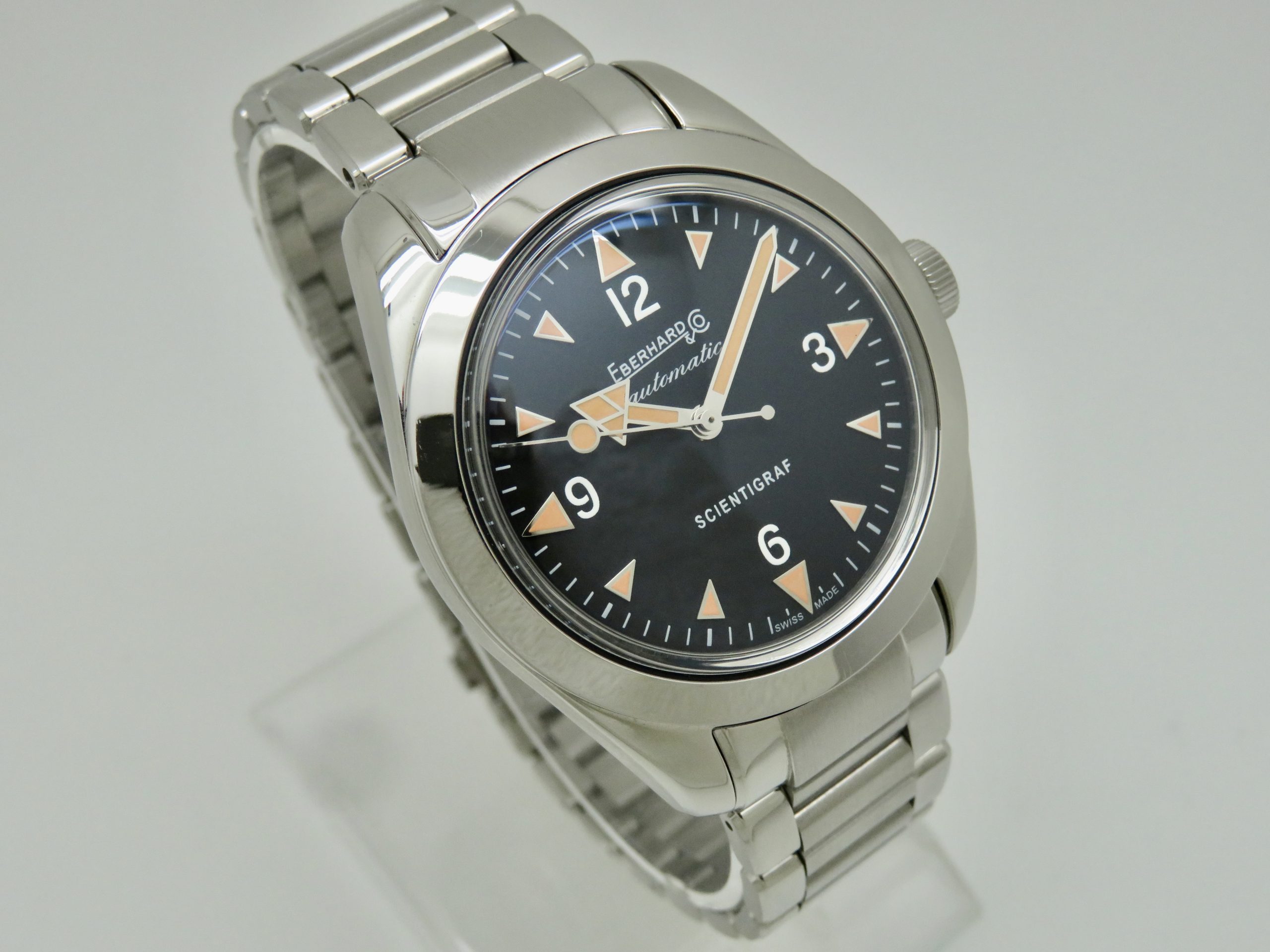 For sale is a mens 2025 Eberhard Scientigraf automatic wristwatch. The watch model/reference number is 41043.02. The watch features a round stainless steel case, screw in crown, screw in back, sapphire crystal, center seconds hand, hacking seconds, and a caliber SW 300-1 movement (25 jewels, 42 hour power reserve, and a bph of 28,800). The watch measures approximately 41mm in diameter without the crown, by 50mm lug tip to tip, has a lug width of 20mm, and a case thickness of 11.3mm. The watch fits wrist sizes of up to 8.25 inches.