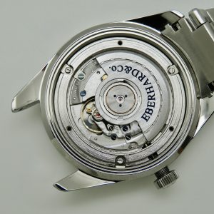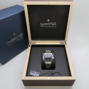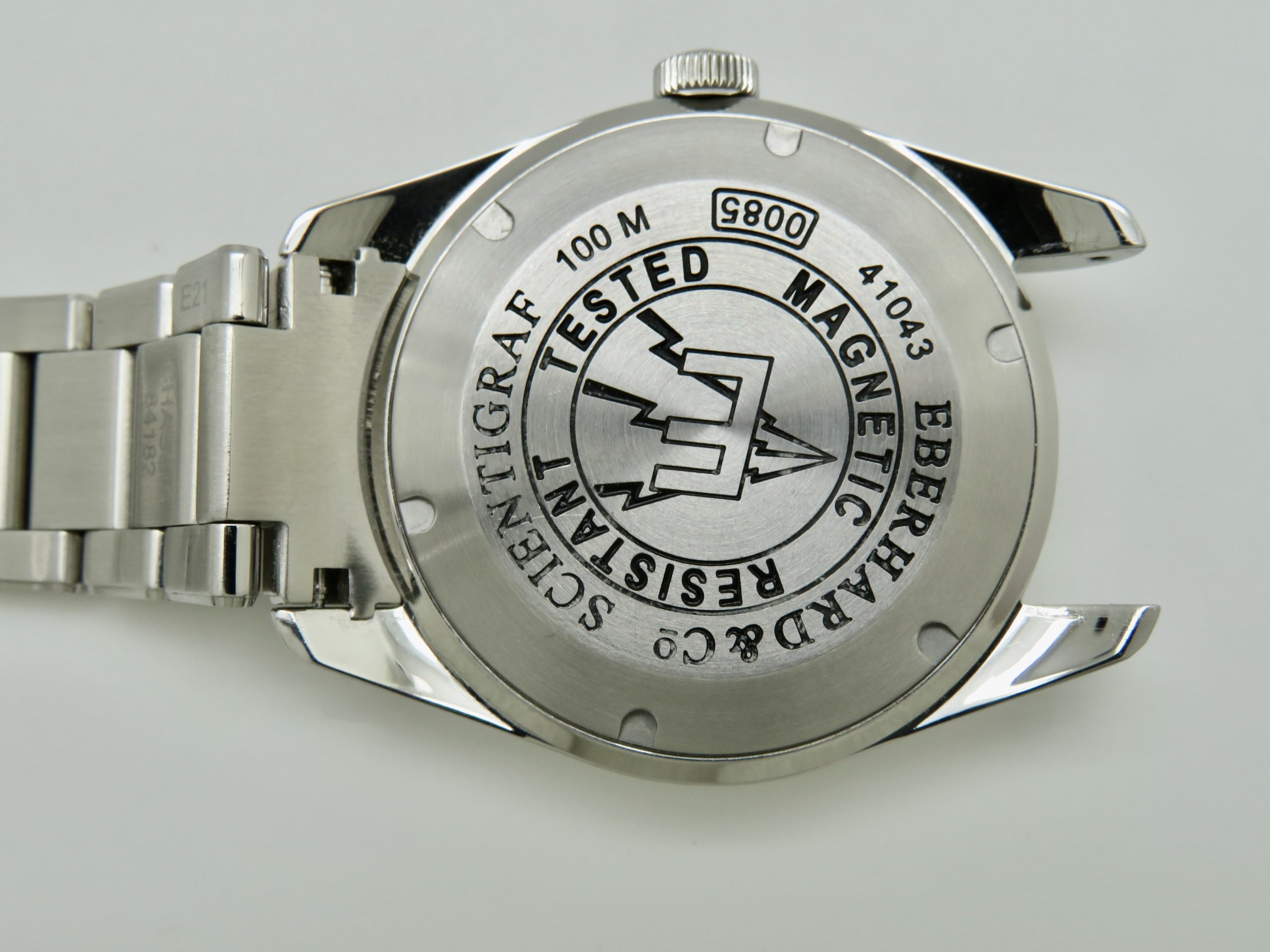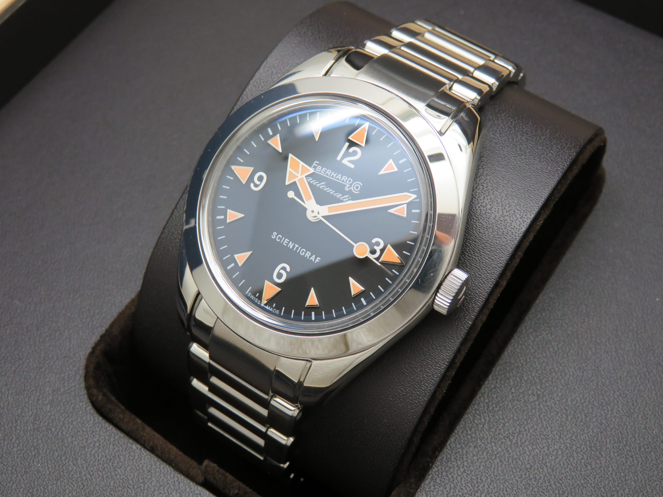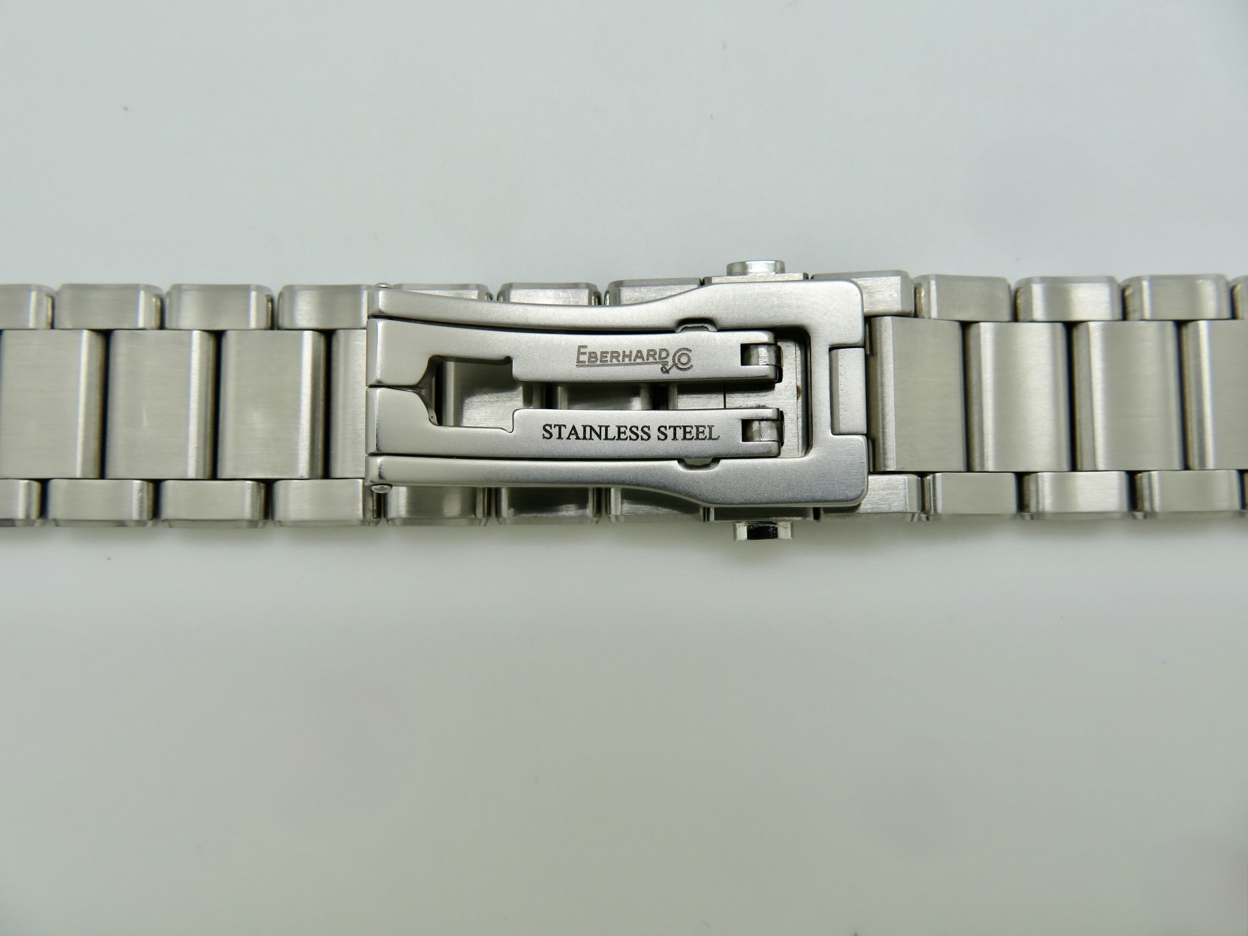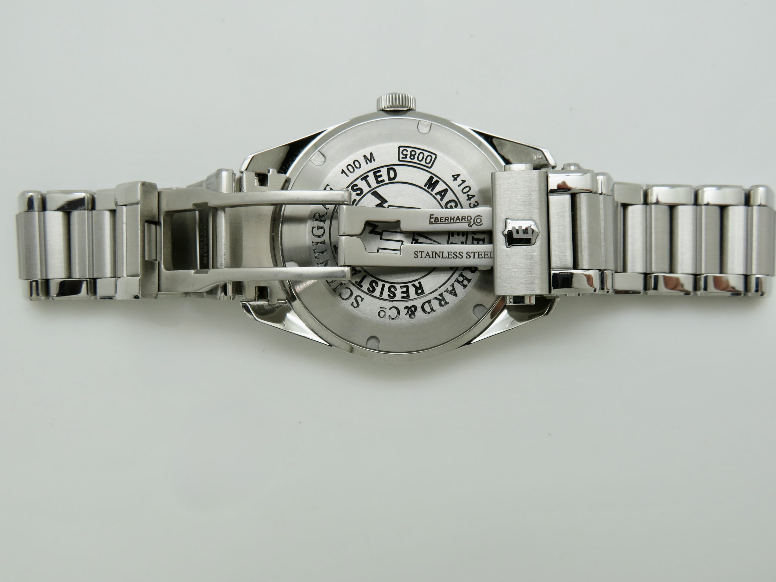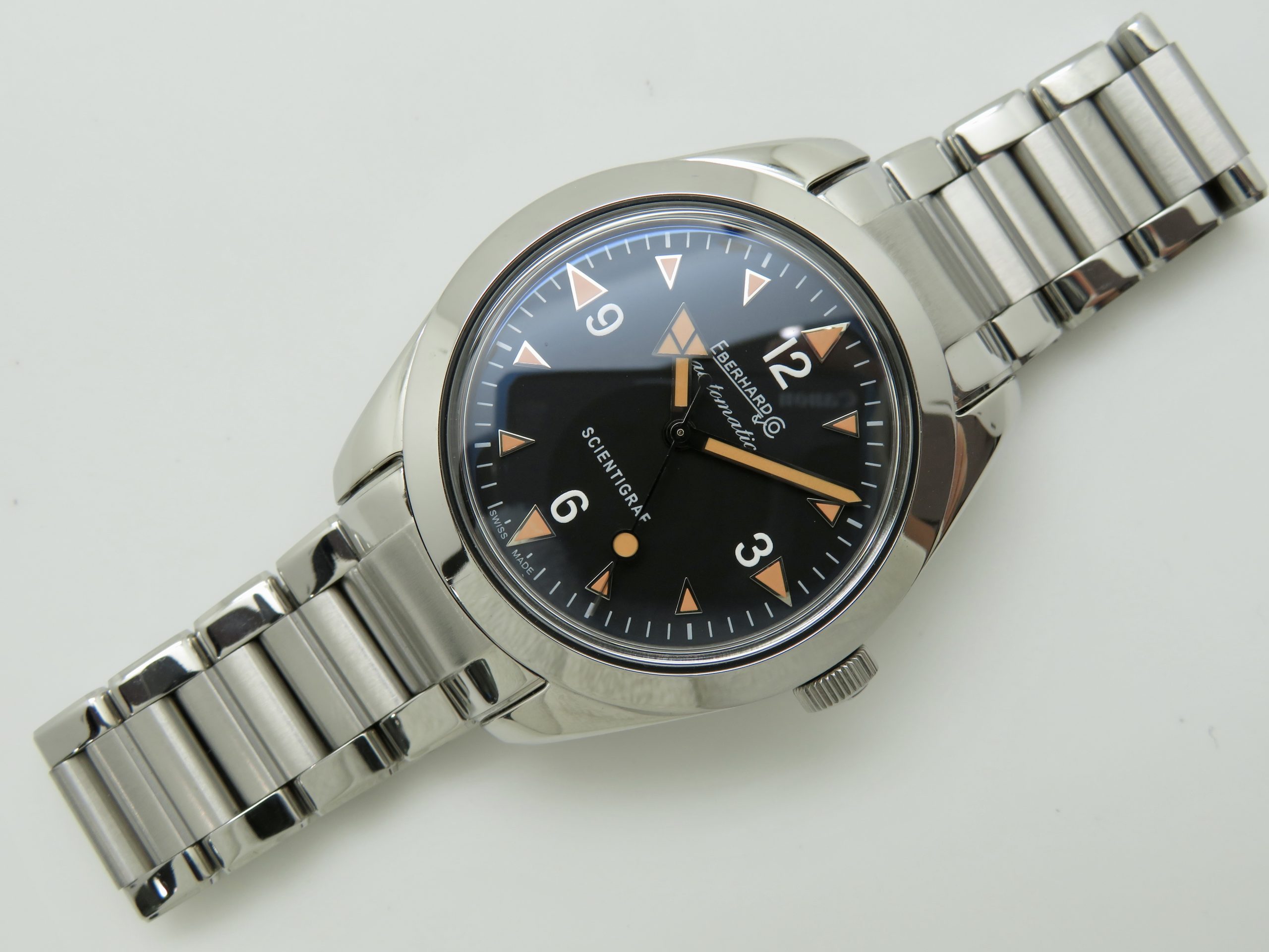 For sale is a mens 2025 Eberhard Scientigraf automatic wristwatch. The watch model/reference number is 41043.02. The watch features a round stainless steel case, screw in crown, screw in back, sapphire crystal, center seconds hand, hacking seconds, and a caliber SW 300-1 movement (25 jewels, 42 hour power reserve, and a bph of 28,800). The watch measures approximately 41mm in diameter without the crown, by 50mm lug tip to tip, has a lug width of 20mm, and a case thickness of 11.3mm. The watch fits wrist sizes of up to 8.25 inches.