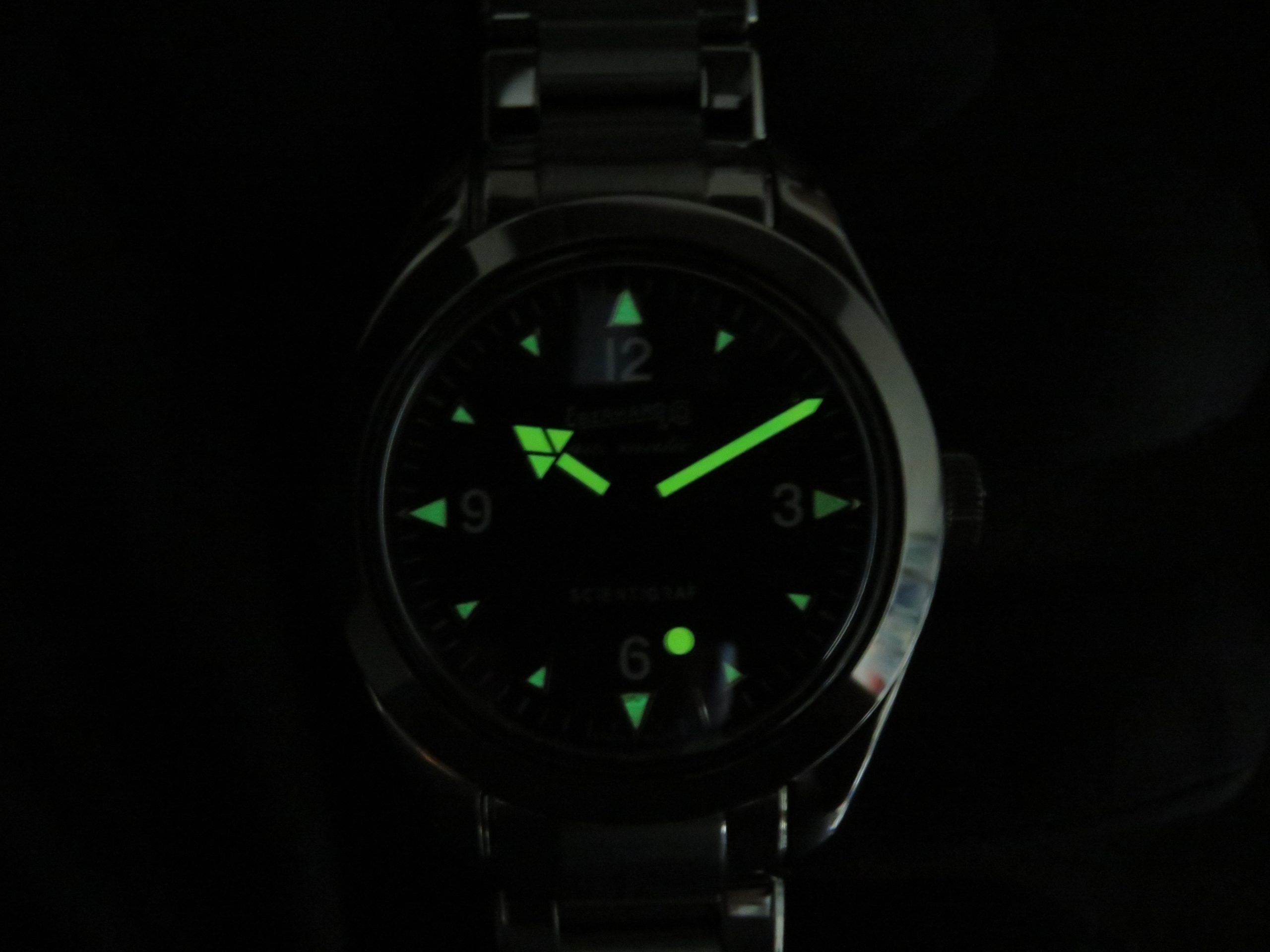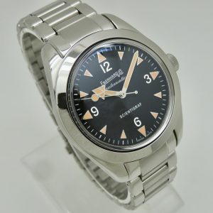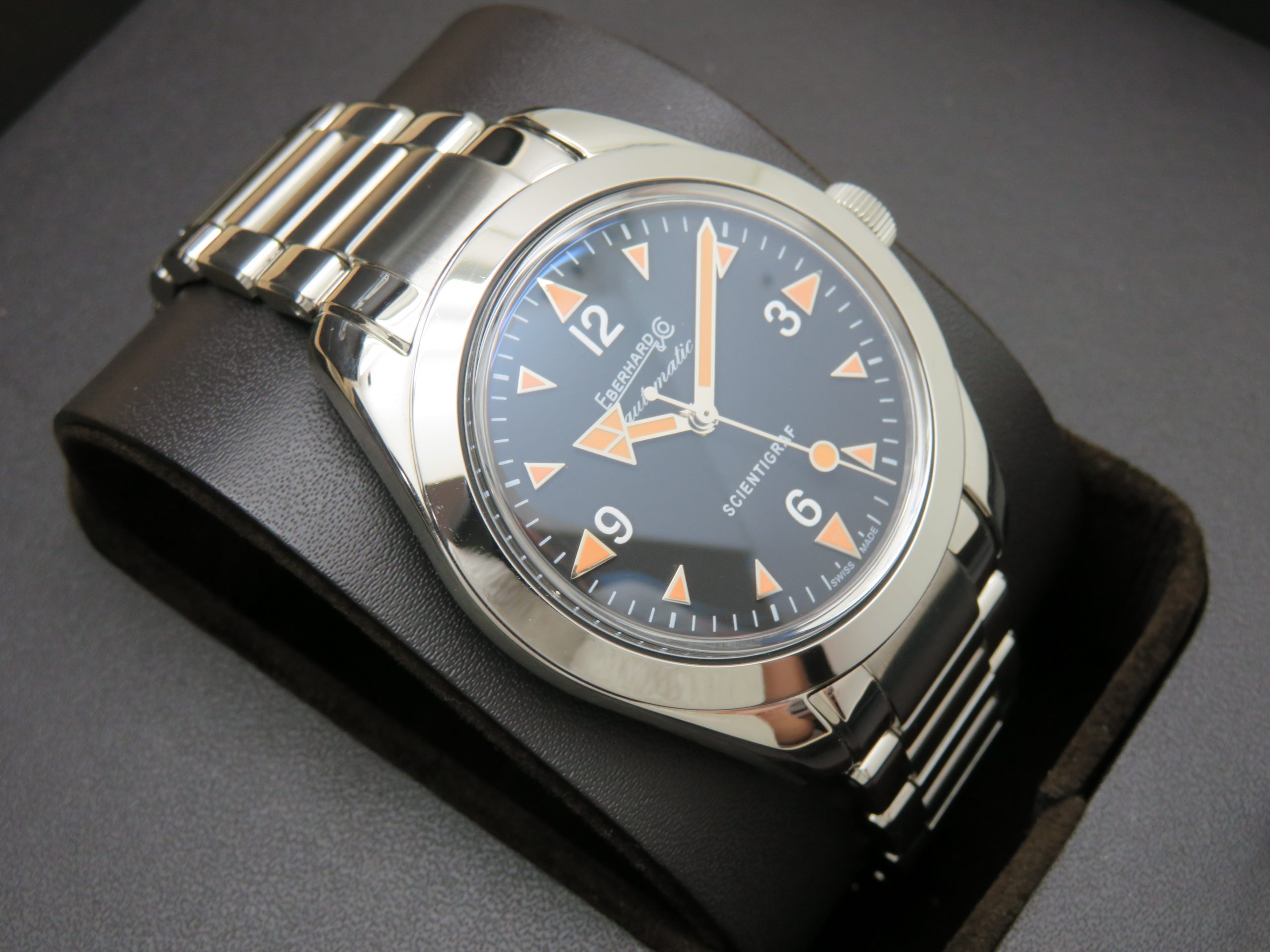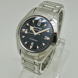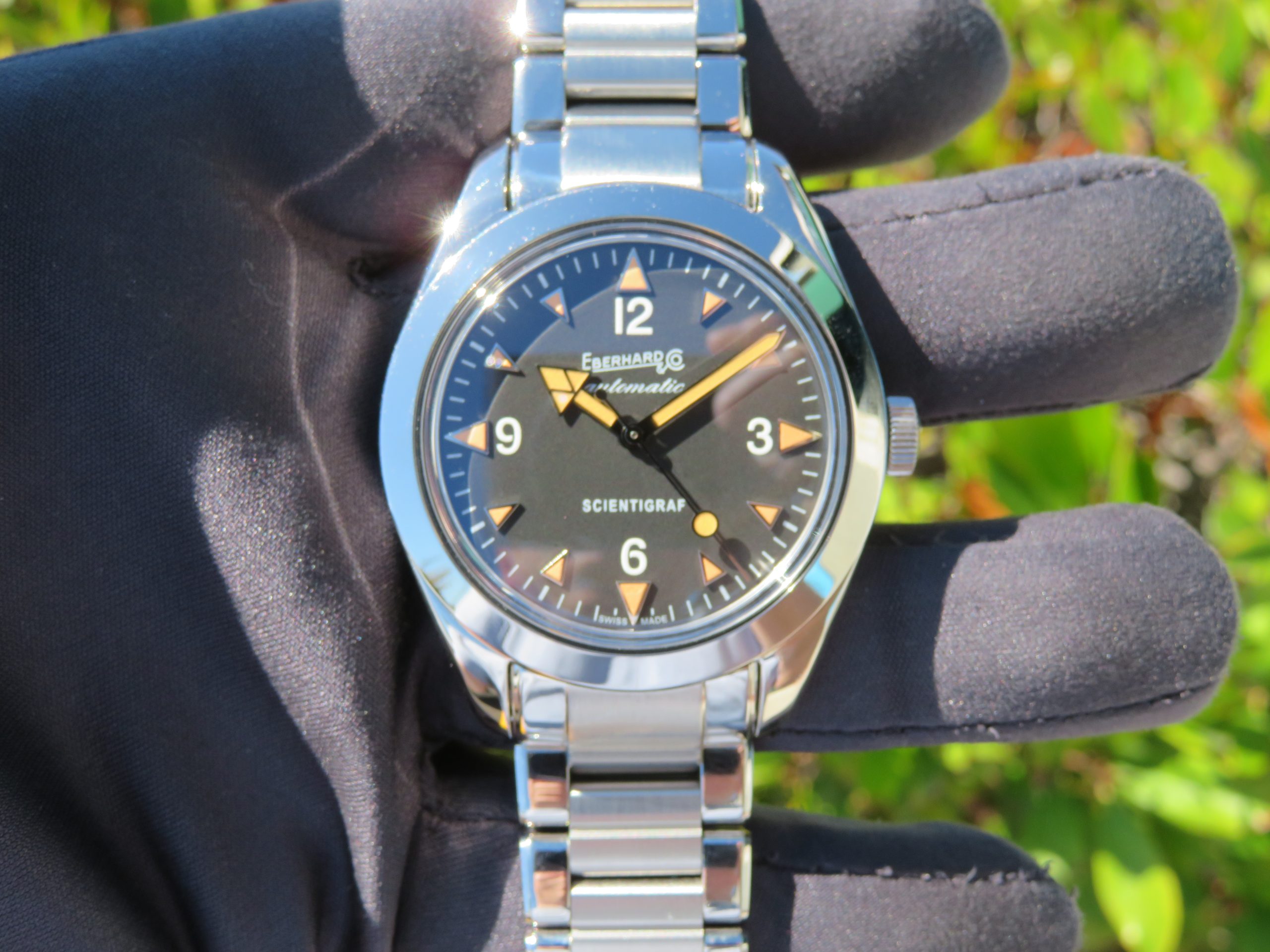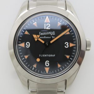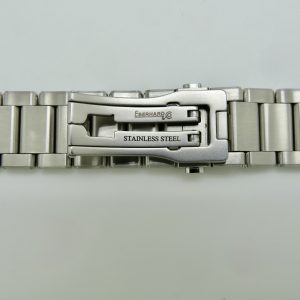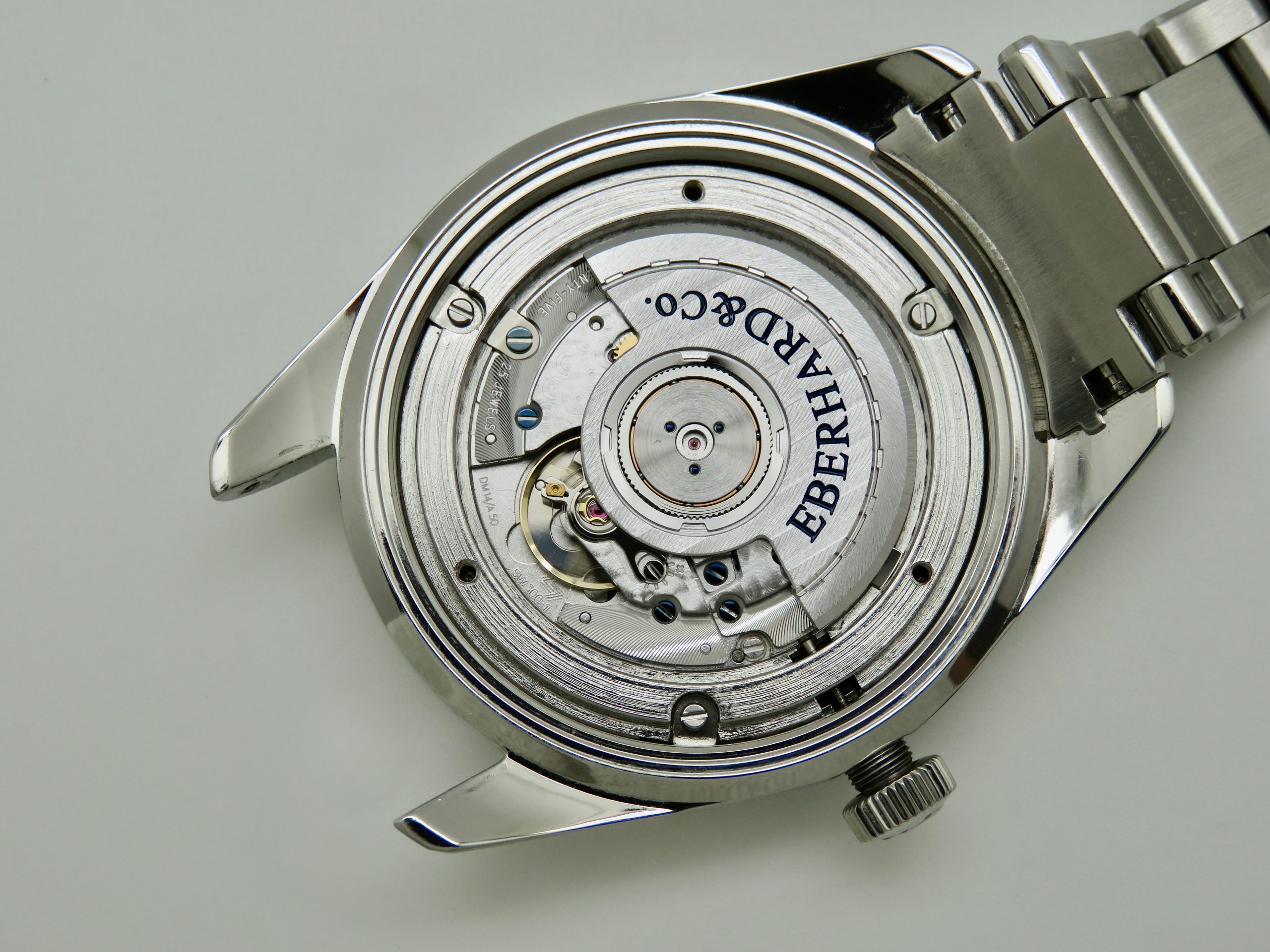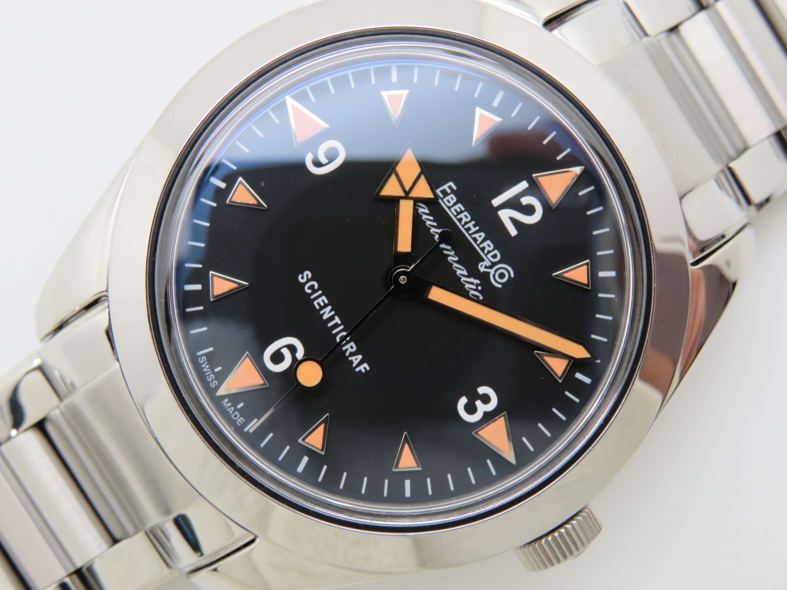 For sale is a mens 2025 Eberhard Scientigraf automatic wristwatch. The watch model/reference number is 41043.02. The watch features a round stainless steel case, screw in crown, screw in back, sapphire crystal, center seconds hand, hacking seconds, and a caliber SW 300-1 movement (25 jewels, 42 hour power reserve, and a bph of 28,800). The watch measures approximately 41mm in diameter without the crown, by 50mm lug tip to tip, has a lug width of 20mm, and a case thickness of 11.3mm. The watch fits wrist sizes of up to 8.25 inches.