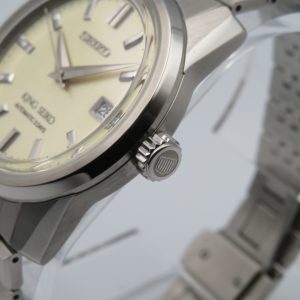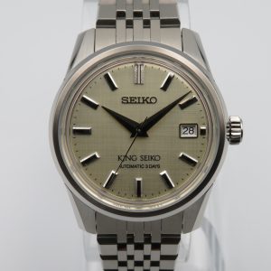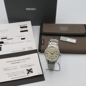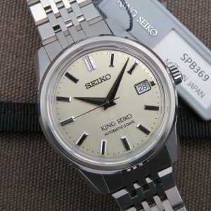 For sale is a pre-owned 2025 Men’s King Seiko, model number SPB369, with a light beige linen dial. This watch was purchased directly from a Seiko AD online by the original owner (not us) and was shipped directly to them, so the watch does not have any original papers, just the original box, hangtag, and order receipt. The bracelet has all the original links. The watch is 100% genuine and working – we’re backing this watch with a 2-year warranty through our shop. It’s pre-owned, so it carries some surface scratches and scuffs on the case and bracelet; however, the dial and sapphire crystal remain clean and scratch free.