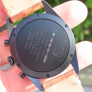 Features: Black stainless steel case and bezel, sapphire crystal, chronograph function, push/pull crown, quick set date, screw-down case back, and a two-piece brown leather strap.