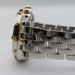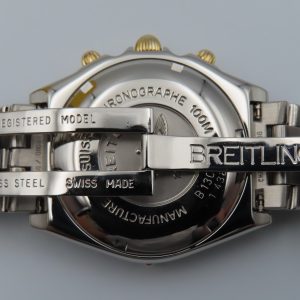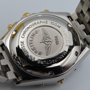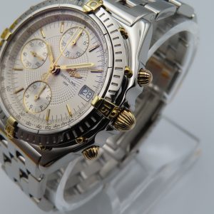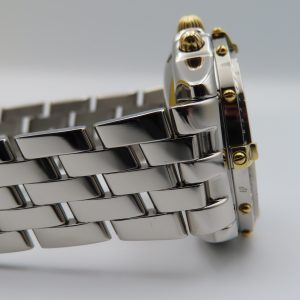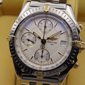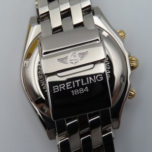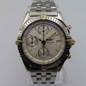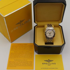 For sale is a pre-owned men’s Breitling Chronomat, model/reference number B13050.1. The watch comes exactly as pictured and has the original box, authorized distributor’s manual, and the Breitling presentation manual. The watch does not have the original warranty paperwork, so the exact year is unknown but suspected to be from circa 1995-2004. The watch is 100% original inside and out. The exact service history on this watch is unknown; however, it’s running accurately and functioning as it should.