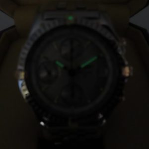 The watch is pre-owned, so you can expect light surface scratches and scuffs throughout the case, bezel, and bracelet. The sapphire crystal has surface scratches on the AR coating. The lume on the hands and the pip on the bezel work; however, the small lume plots on the dial fade quickly. The bracelet clasp closes firmly, and the bezel rotates well without any issues. Please note that the box is flaking inside and is in poor condition. The outer box has some surface marks on it from handling and storage.