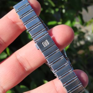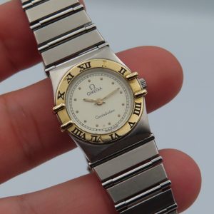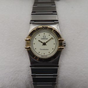 Features:Â Stainless steel case and bracelet, 18k yellow gold bezel, sapphire crystal, push/pull crown, push-button clasp, solid case back, and a quartz Omega movement with 6 jewels.
