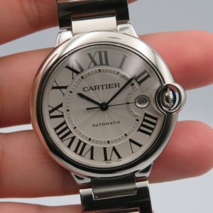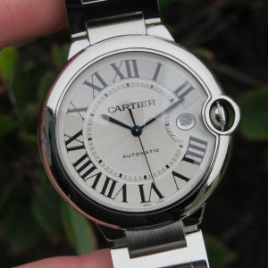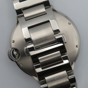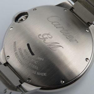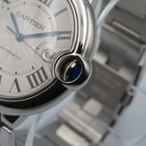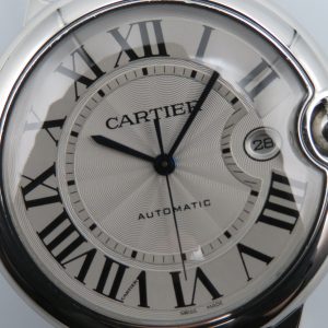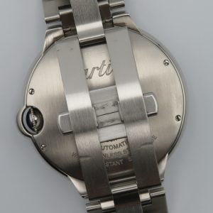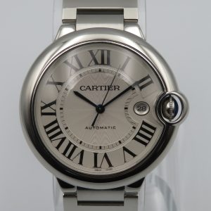 For sale is a pre-owned men’s Cartier Ballon Bleu 42mm, model number 3001/W69012Z4. It comes as watch only, with no original box or papers, so the exact year is unknown; it could be from anywhere during 2007–2021. The watch is 100% original inside and out, with the full amount of bracelet links. The watch was serviced by us 12/2025, and it’s working perfectly and keeping accurate timing. The watch was also polished in the past but still has slight surface scratches and scuffs, and minor dents on the case and bezel that are still visible even after the watch has been polished. Despite all the cosmetic imperfections, the watch does not have any broken or missing parts.