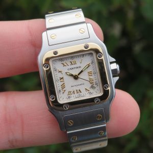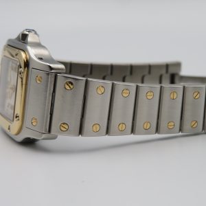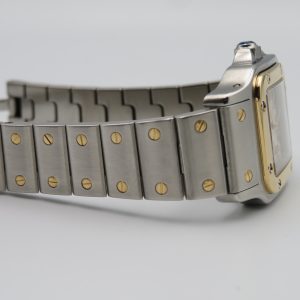For sale is a beautiful pre-owned ladies vintage Cartier Santos Galbee automatic with date, reference number 2423, with a factory guilloché dial from circa early 2000sThis watch does not include any original box or papers, so the exact year is unknown, and it is missing some links (we do not have any extras to add). To ensure this watch will fit comfortably, please read the entire item listing.