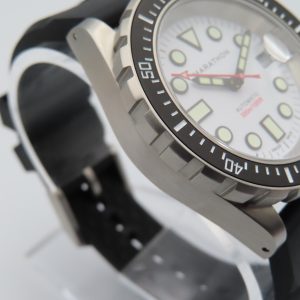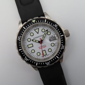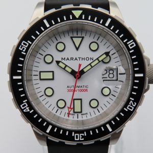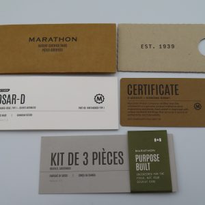 For sale is a pre-owned men’s Marathon Arctic Original Search & Rescue (OSAR-D) wristwatch. The watch comes with the original box and papers. The warranty certificate does not list the purchase year, so the exact year is unknown. It also includes an extra unused nylon strap in the original packaging.