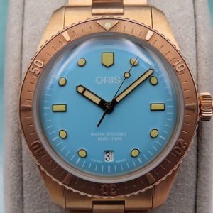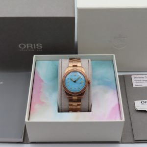 For sale is a new men’s Oris Diver’s Sixty-Five Cotton Candy 38mm, model number 01 733 7771 3155. It is unworn and unsized; however, it was previously displayed at an Oris Authorized Dealer, resulting in a few very minor handling marks on the case and bracelet. The watch comes with the original box, papers, hangtag, and product manual.