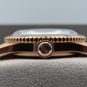 Features: Bronze case, bracelet, and bezel; screw-down crown; luminous hands and indices; unidirectional rotating bezel; screw-down case back; and a Caliber 733 automatic movement with 26 jewels and a 38-hour power reserve.