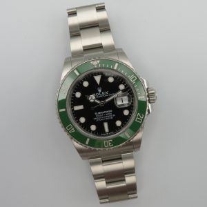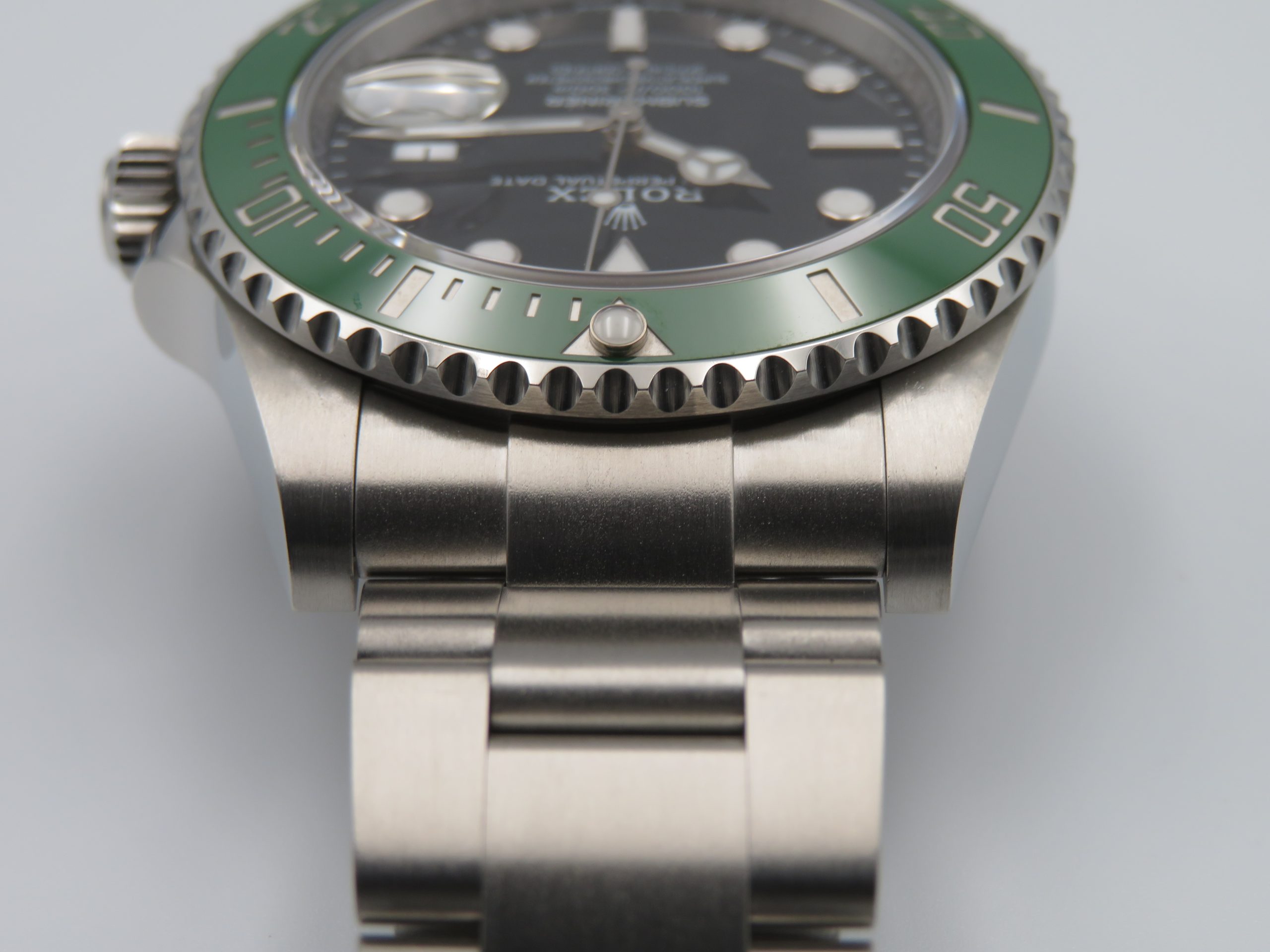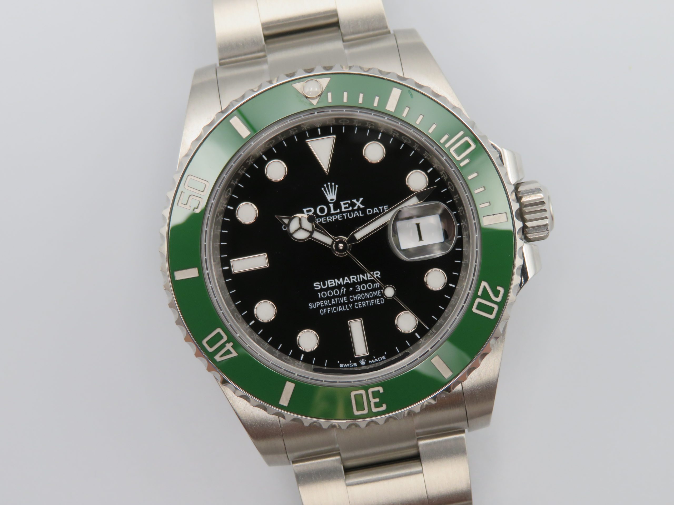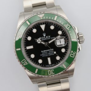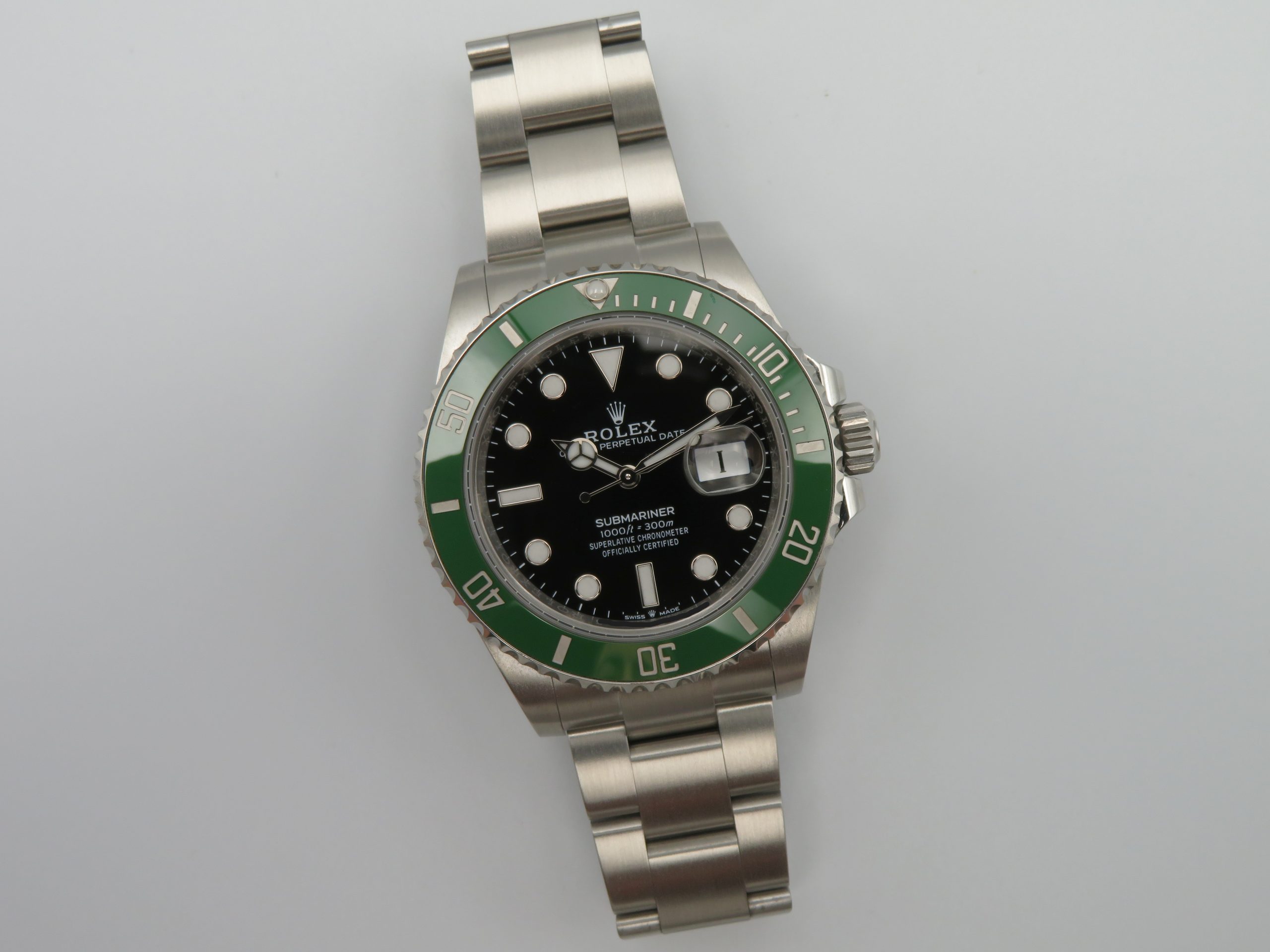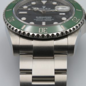 Features: Green ceramic bezel, date with quickset, screw-down crown, screw-back case, and Oyster bracelet with folding clasp and diving extension.