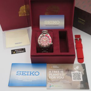 For sale is a pre-owned men’s Seiko Prospex Sumo Philippines Limited Edition “Red Eagle”, model/reference number SPB345. The watch comes with the original box and papers; however, the authorized dealer who sold the original owner the watch only stamped their name and did not fill in the exact purchase date, so it is unknown but suspected to be from circa 2022. Additionally, the watch is missing the original brown strap it originally came with. The red rubber strap pictured is aftermarket and not a Seiko strap.