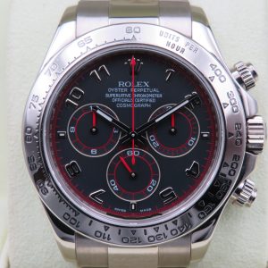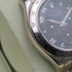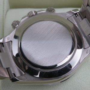 Features: 18k white gold case, bracelet, and bezel; original sapphire crystal with laser-etched coronet; screw-down crown; screw-down pushers; screw-back case; chronograph function; and a Cal. 4130 automatic movement with 44 jewels.