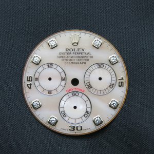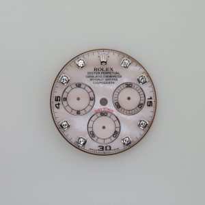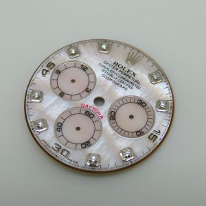 For sale is an OEM Rolex Daytona Rose Mother of Pearl Diamond Dial. This dial was previously mounted on a Rolex Daytona 116519 and is in excellent condition with no cracks. It is compatible with both the 116519 and 116509 models. The markers are white gold.