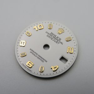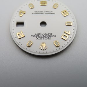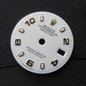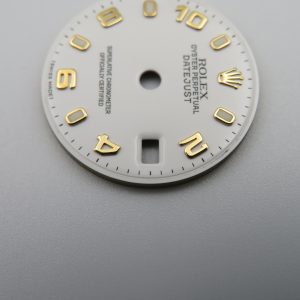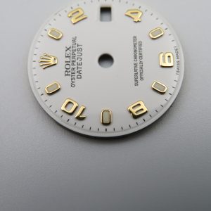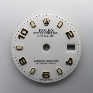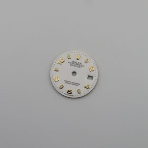 For sale is a pre-owned Rolex Lady-Datejust 26mm white dial. This dial is in good overall condition. It does not have any major cracks, but it does show minor signs of use on the Arabic numerals. The lume works perfectly; it is still strong and has no issues.