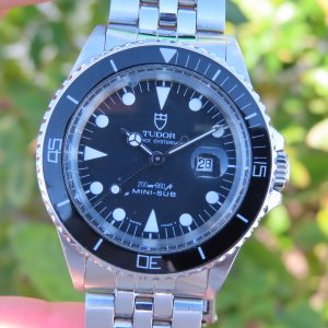 For sale is a vintage circa 1989 Tudor Prince Oysterdate Mini-Sub 200m, model/reference number 73090, with the original box and papers. The papers do not list the exact purchase date, so it remains unknown. The dial is stamped “T Swiss Made T,” and the lume on the dial and hands is original. The watch is running perfectly with no issues and is keeping accurate time. It was serviced in-house by us and comes with a 1-year warranty.